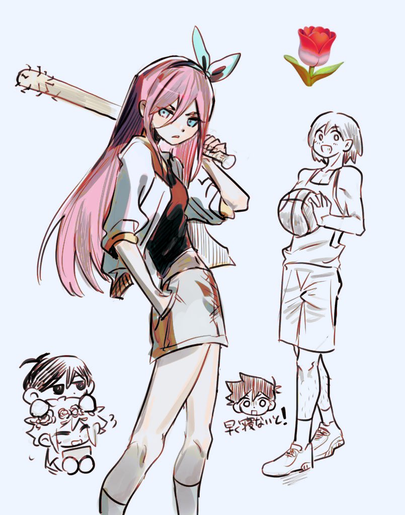aubrey_(omori) basil_(omori) blue_eyes bright_pupils denim denim_skirt emoji hair_behind_ear hair_tie jacket omori open_clothes open_jacket partially_colored pink_hair sketch skinny skirt sunny_(omori) wanosaku white_background