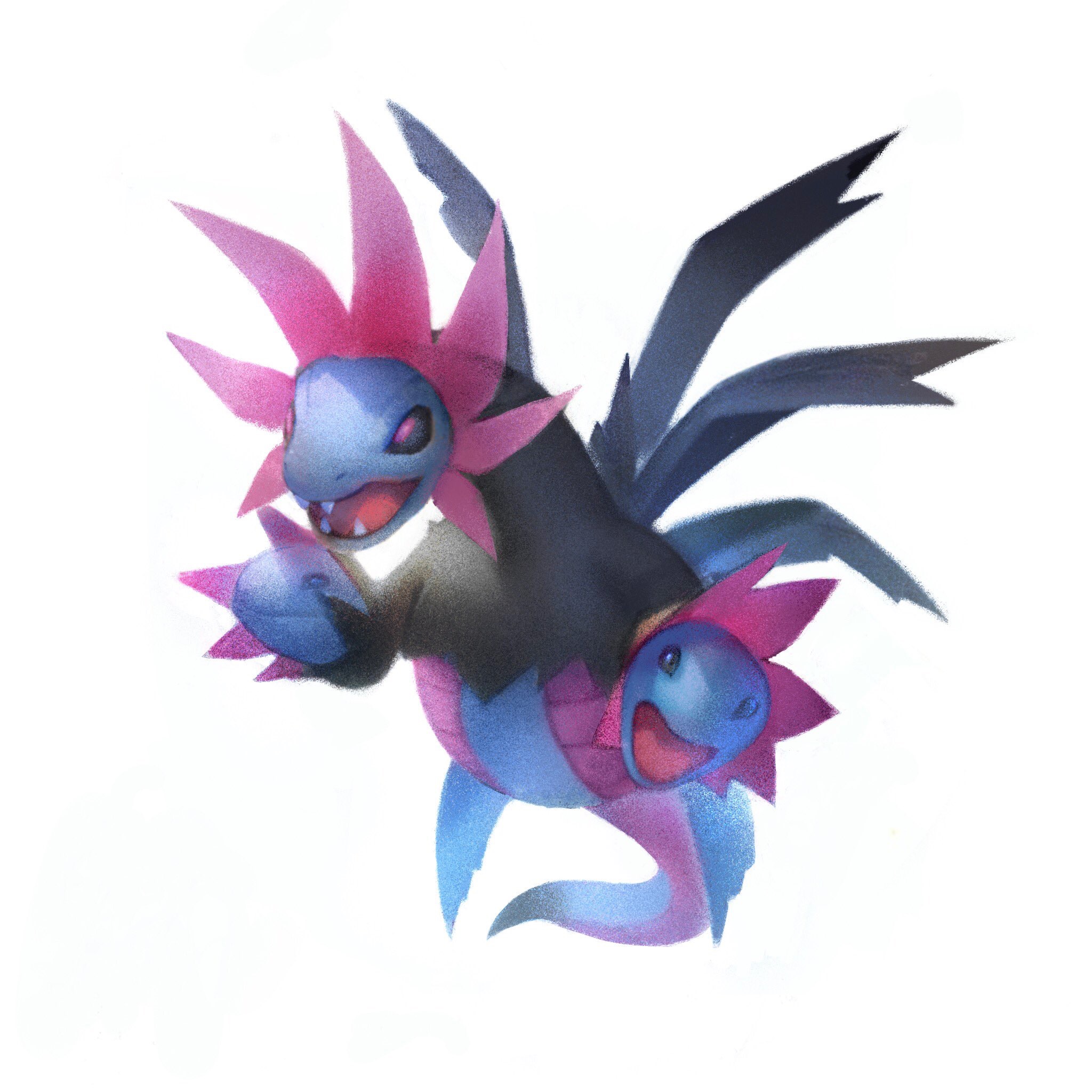 animal_focus commentary floating full_body gen_5_pokemon highres hydreigon looking_at_viewer nintendo no_humans open_mouth pokemon pokemon_(creature) shiratsuyu_mone simple_background solo untranslatable_commentary white_background