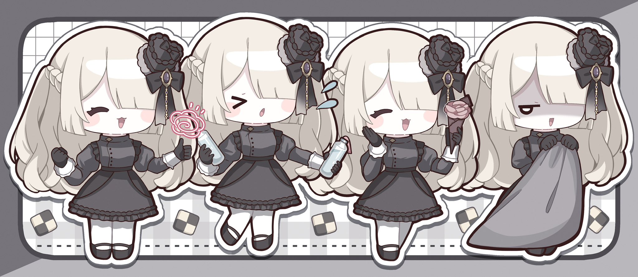 >_< 1girl :3 :d :o ^_^ black_bow black_dress black_gloves black_hat black_shoes blonde_hair blunt_bangs blush_stickers border bottle bow checkerboard_cookie chibi chibi_only closed_eyes commentary commission cookie dress food full_body gloves grey_background grey_border grid_background hair_bow hair_over_one_eye hat highres holding holding_bottle indie_virtual_youtuber jitome long_hair long_sleeves looking_to_the_side multiple_views nada_namie open_mouth outline outside_border pantyhose parted_bangs shaded_face shoes skeb_commission smile standing suitsu_mahoro thumbs_up virtual_youtuber white_background white_outline white_pantyhose