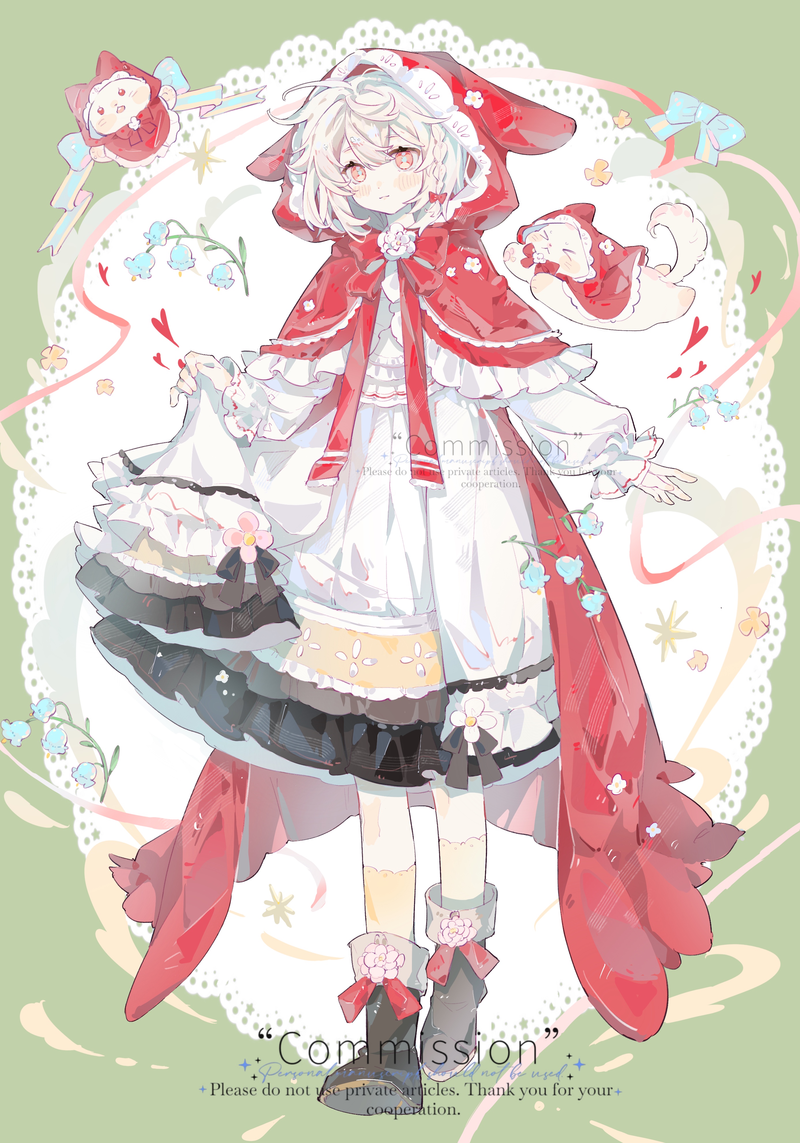1girl absurdres black_boots blush_stickers boots border capelet closed_mouth commission cuicui_sumi_tiao dress frilled_capelet frills full_body green_border highres holding_own_dress hood hood_up hooded_capelet long_sleeves original outside_border red_capelet red_eyes short_hair socks solo standing watermark white_dress white_hair yellow_socks
