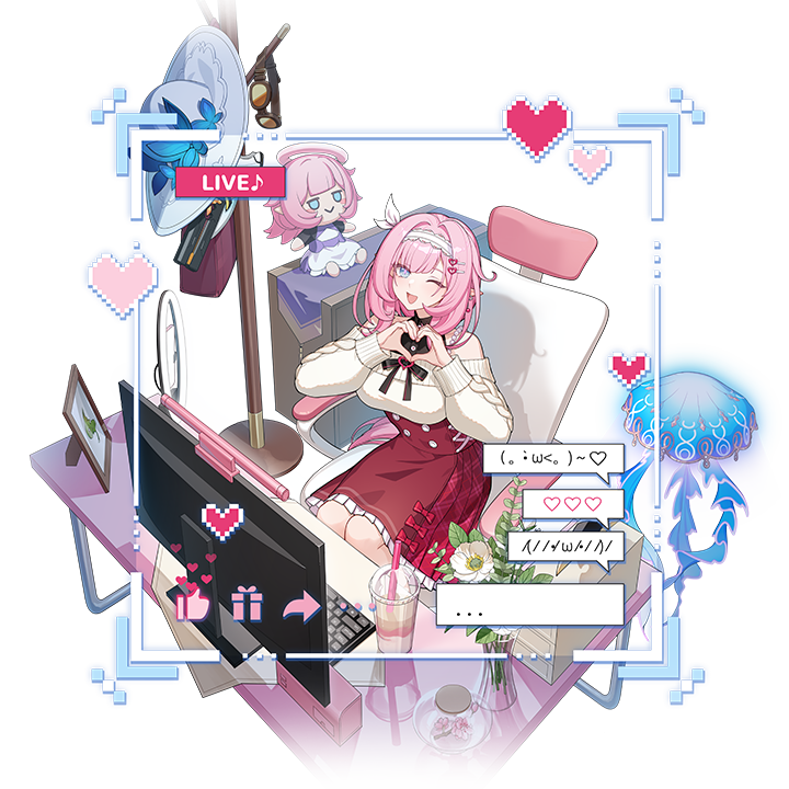 1girl bad_link bad_miyoushe_link blue_eyes bright_pupils chair character_doll chinese_commentary commentary_request computer computer_keyboard desk doll dress drinking_straw elf_elysia elysia_(honkai_impact) flower gun hair_ornament hairband hairclip hat heart heart_hands honkai_(series) honkai_impact_3rd jewelry light_blush long_sleeves looking_at_viewer musical_note off-shoulder_dress off_shoulder official_alternate_costume official_art on_chair one_eye_closed open_mouth picture_frame pink_hair pink_pupils smile transparent_background weapon white_hairband white_hat