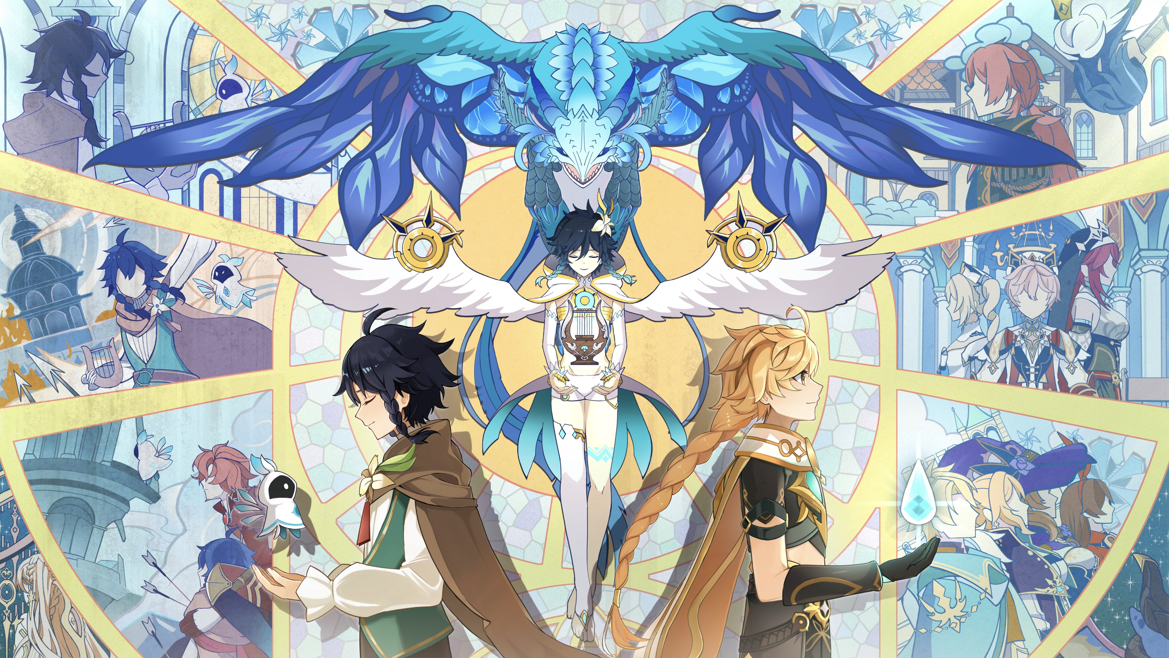 5girls 6+boys absurdres aether_(genshin_impact) amber_(genshin_impact) barbara_(genshin_impact) black_gloves black_hair blonde_hair braid brown_cape cape closed_eyes dahlia_(genshin_impact) dvalin_(genshin_impact) flower genshin_impact gloves gradient_hair green_vest hair_flower hair_ornament highres hoyofair instrument jean_(genshin_impact) leg_tattoo lisa_(genshin_impact) lyre male_focus multicolored_hair multiple_boys multiple_girls multiple_views nameless_bard_(genshin_impact) rosaria_(genshin_impact) shiba_(tonari_no_shiba_inu) shorts single_braid smile tattoo twin_braids varka_(genshin_impact) venti_(archon)_(genshin_impact) venti_(genshin_impact) vest white_shorts white_wings wings