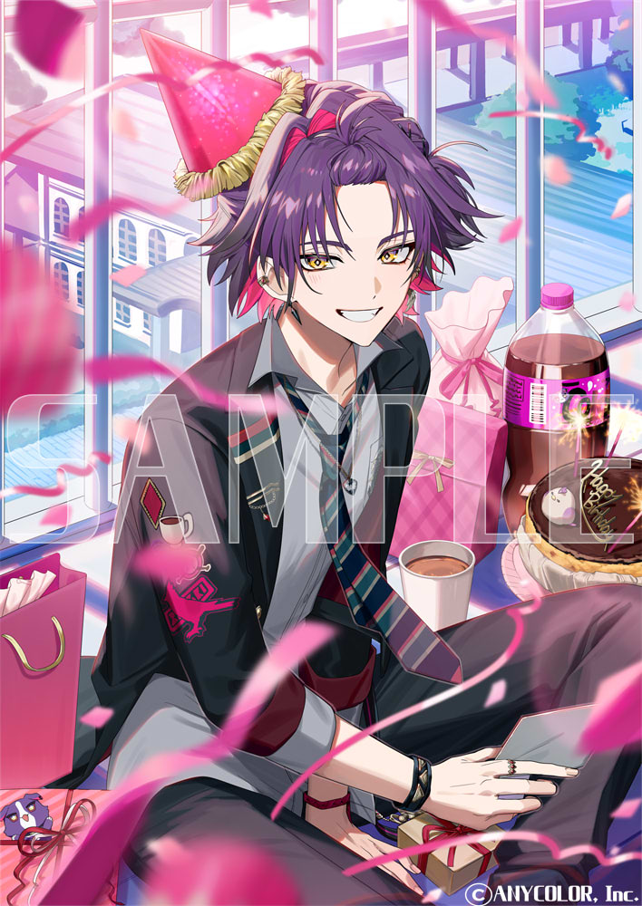1boy bag black_jacket black_necktie black_pants blurry bottle bracelet cake collared_shirt colored_inner_hair commentary_request company_name copyright_notice cup depth_of_field earrings fingernails food grey_shirt grin happy_birthday hat jacket jewelry looking_at_viewer male_focus multicolored_hair necktie nijisanji ninahachi official_alternate_costume official_alternate_hairstyle official_art pants party_hat pink_hair purple_hair ring sample_watermark shirt smile solo streamers teeth two-tone_hair virtual_youtuber watarai_hibari watarai_hibari_(school_uniform) watermark yellow_eyes