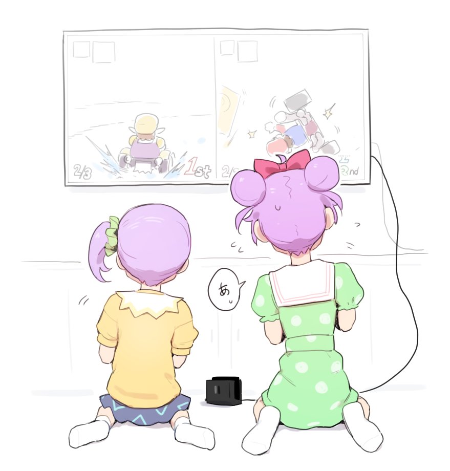 2girls blue_skirt bow carol.j.jamison double_bun dress facing_away from_behind full_body green_dress hair_bow hair_bun manaka_laala manaka_laala_(normal) manaka_non manaka_non_(normal) mario_(series) mario_kart multiple_girls nintendo nintendo_switch no_shoes pink_bow playing_games playing_video_games pretty_series pripara purple_hair shirt short_hair siblings sisters sitting skirt socks speech_bubble television translation_request wario white_socks yellow_shirt