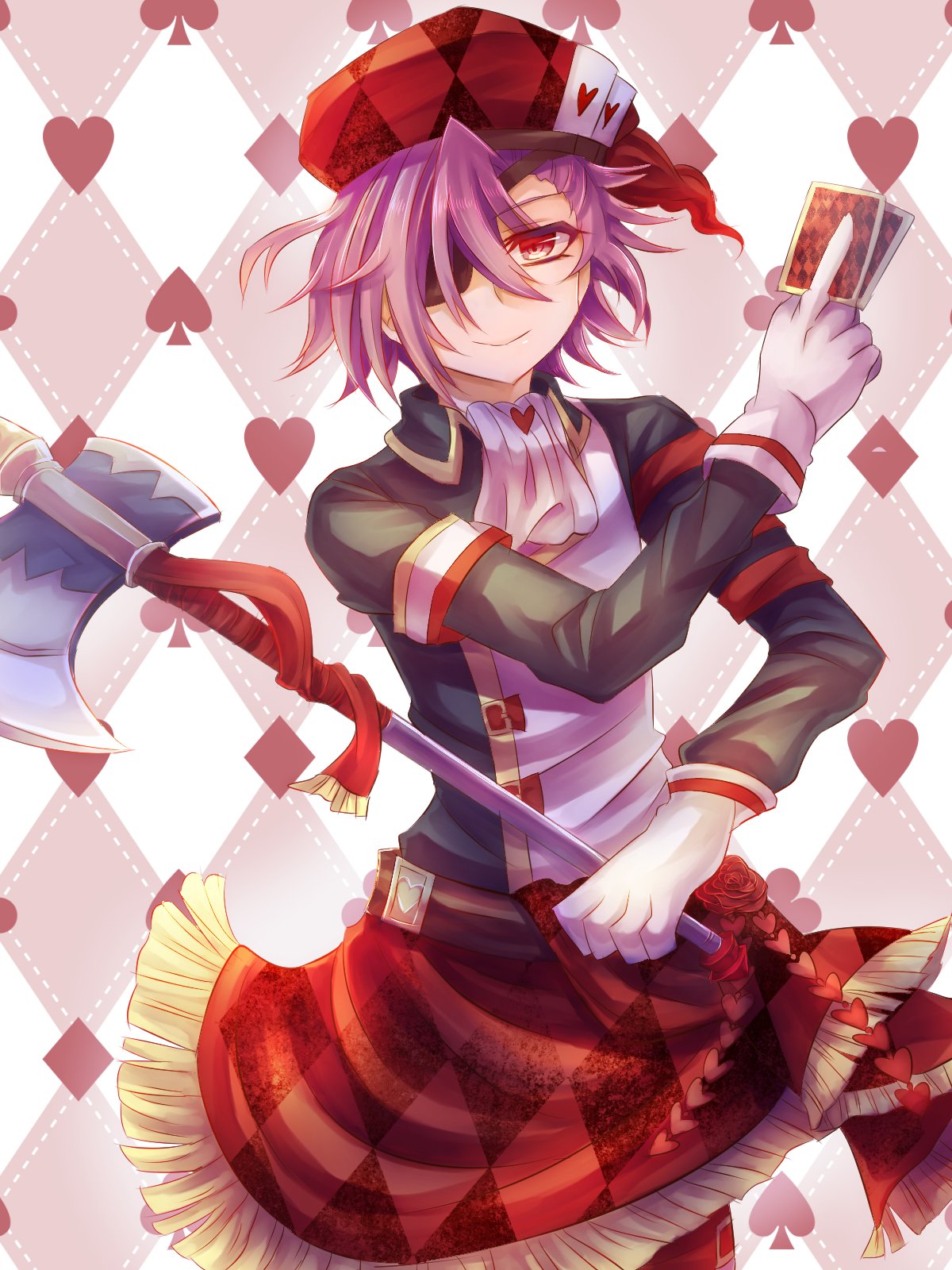 1boy arcanaheart_alma axe black_shirt card checkered_background emil_chronicle_online eyepatch gloves hat highres holding holding_axe holding_card red_eyes red_hat red_skirt shirt sizuoka0616 skirt solo two-tone_shirt white_gloves white_shirt