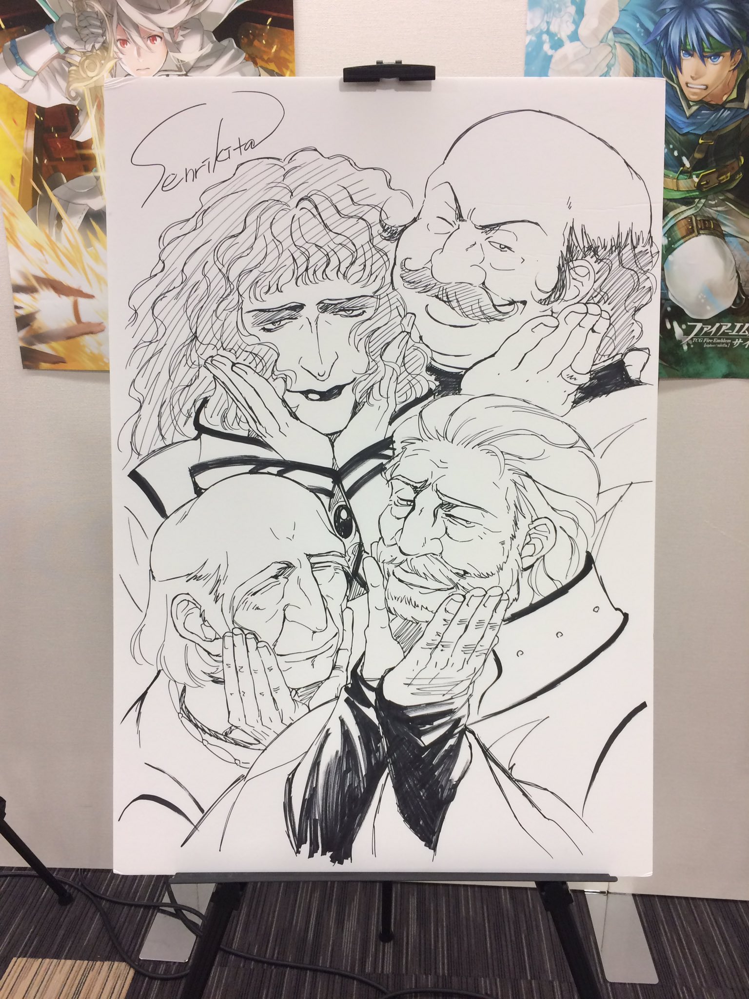 4boys bald beard closed_eyes commentary_request facial_hair fire_emblem fire_emblem:_radiant_dawn hetzel_(fire_emblem) highres jewelry kita_senri lekain long_hair male_focus monochrome multiple_boys mustache nintendo old old_man oliver_(fire_emblem) one_eye_closed photo_(medium) ring short_hair signature sketch traditional_media valtome