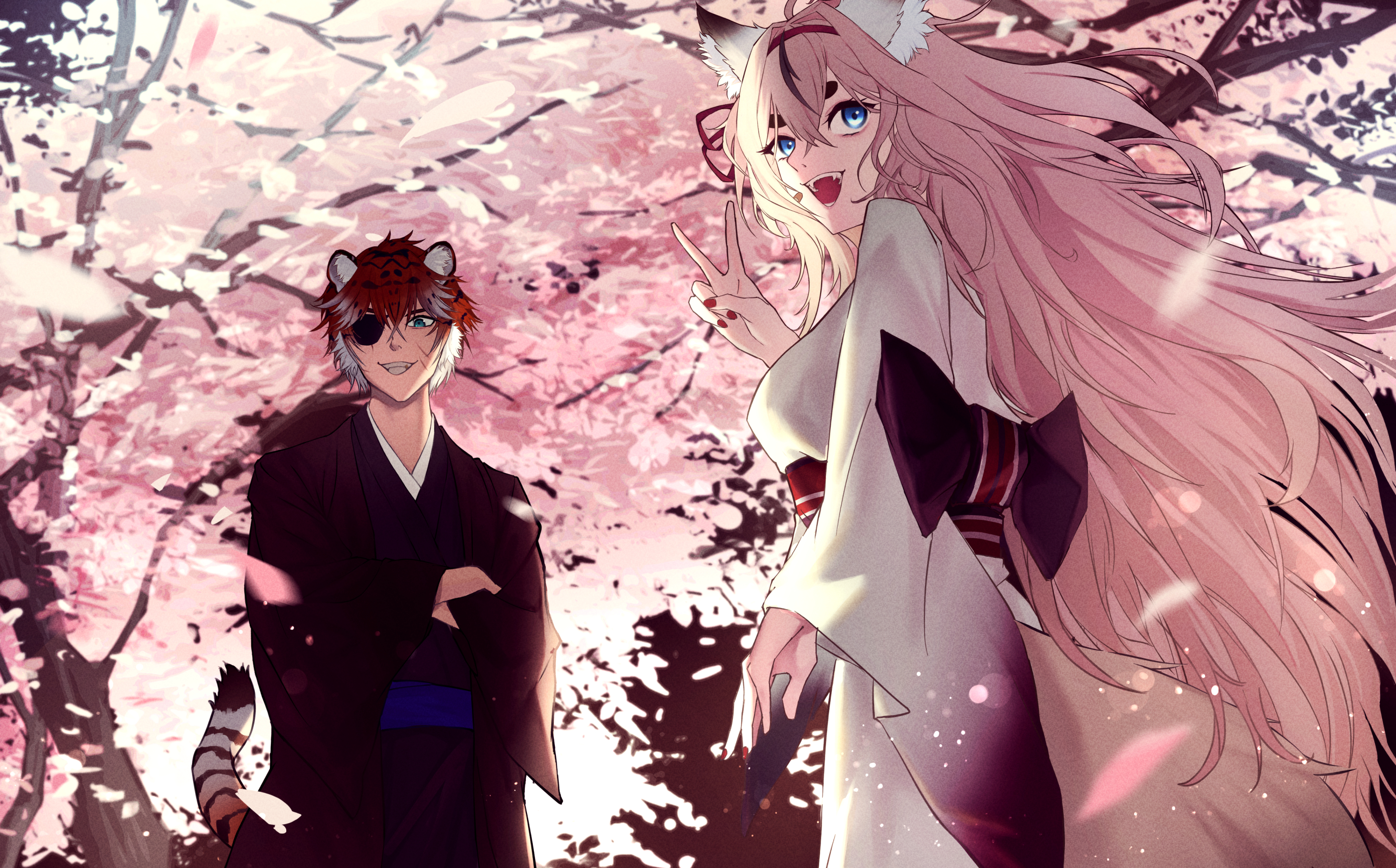1boy 1girl animal_ears black_kimono blue_eyes breasts character_request cherry_blossoms commentary commission cowboy_shot crossed_arms eyepatch facial_scar fangs fox_ears fox_girl fox_tail green_eyes hair_ribbon highres indie_virtual_youtuber japanese_clothes kimono light_particles long_hair long_sleeves looking_at_viewer looking_back madoro_q medium_breasts multicolored_hair nature nose open_mouth outdoors pink_hair red_hair ribbon scar scar_on_cheek scar_on_face selkie_(vtuber) short_hair skeb_commission smile tail teeth tiger_boy tiger_ears tiger_tail two-tone_hair v very_long_hair virtual_youtuber white_hair white_kimono wide_sleeves