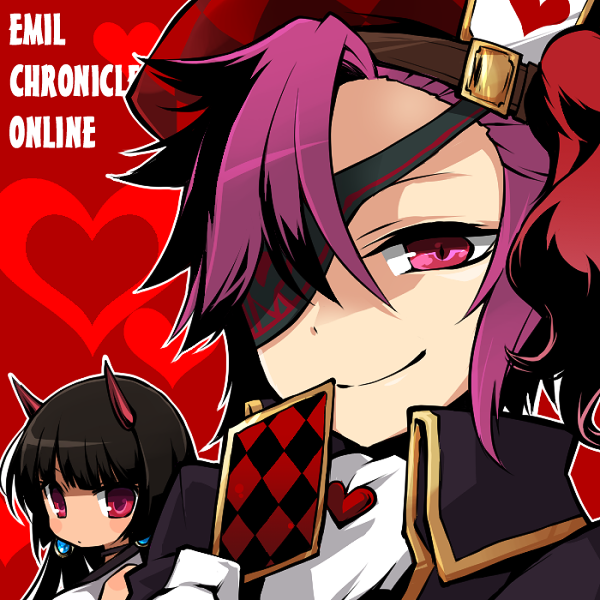 1boy 1girl arcanaheart_alma avatar_(eco) black_hair black_jacket card copyright_name cw_hituzi emil_chronicle_online eyepatch hat heart heart_background holding holding_card horns jacket playing_card purple_eyes purple_hair red_background red_eyes red_hat smile