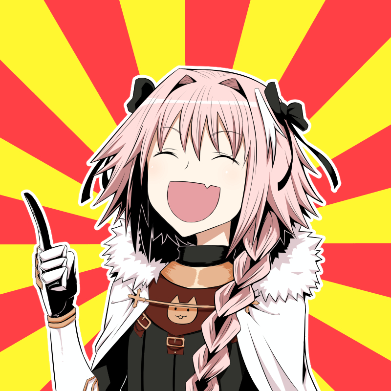 1boy astolfo_(fate) astolfo_(rider)_(fate) birii black_bow black_sweater blush bow braid cape closed_eyes fang fate/apocrypha fate/grand_order fate_(series) fur-trimmed_cape fur_trim gauntlets gorget hair_bow hair_intakes long_hair male_focus multicolored_hair open_mouth pink_hair single_braid skin_fang smile solo streaked_hair striped_background sweater trap two-sided_cape two-sided_fabric two-tone_background upper_body white_cape white_hair