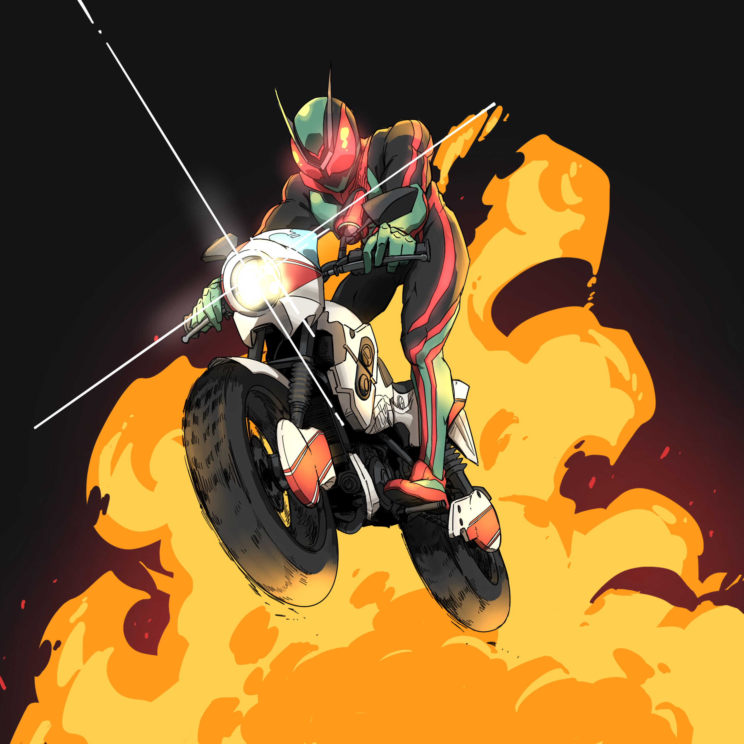absurdres black_bodysuit bodysuit compound_eyes explosion full_body highres kamen_rider kamen_rider_zeztz kamen_rider_zeztz_(series) midair motor_vehicle motorcycle naitsupic on_motorcycle red_eyes riding zero_(kamen_rider_zeztz)