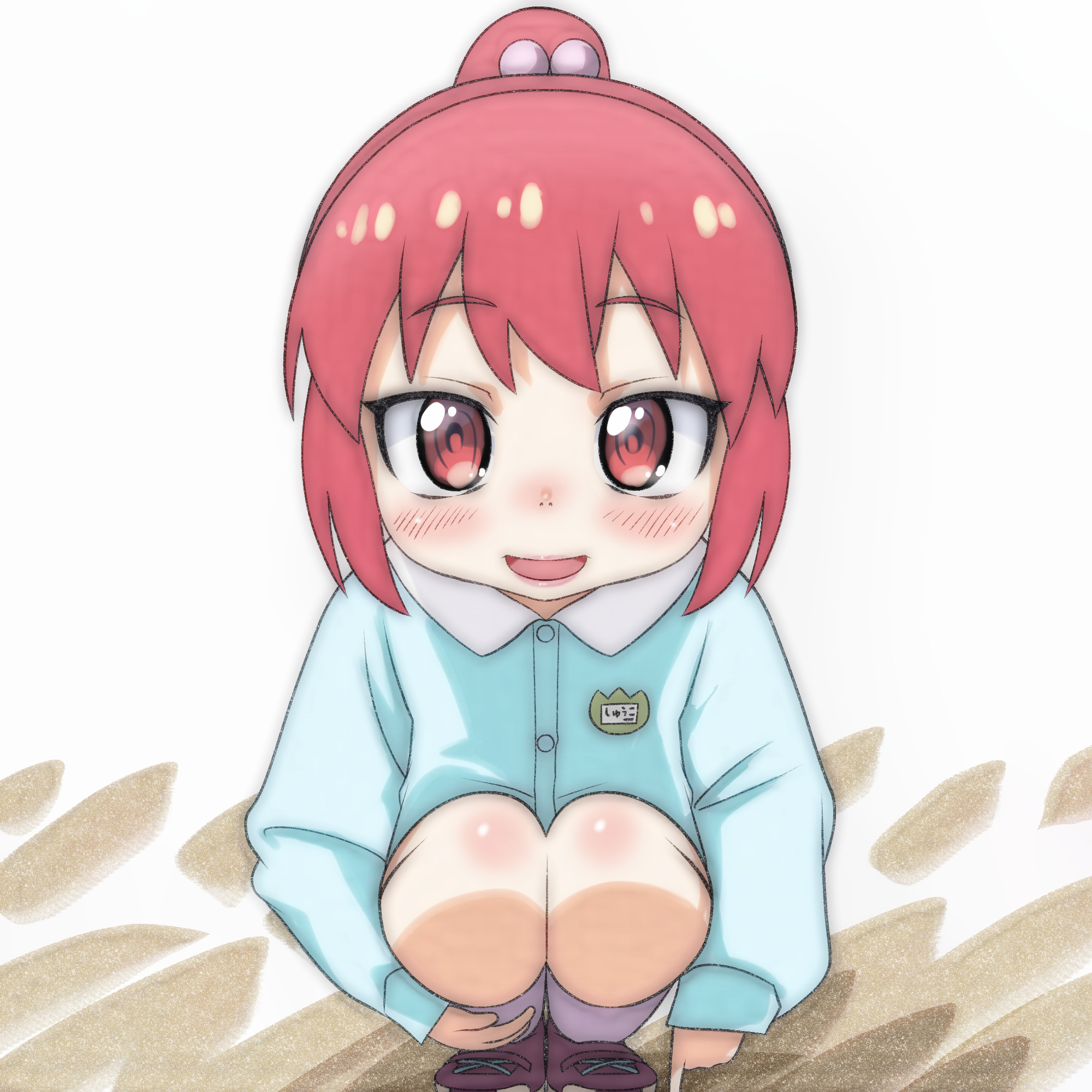 1girl aged_down blue_shirt blush brown_shoes hair_bobbles hair_ornament highres kindergarten_uniform long_hair long_sleeves looking_at_viewer name_tag open_mouth pointing pointing_down ponytail purple_socks red_eyes red_hair ruri_no_houseki sand seto_shouko shirt shoes smile socks squatting t_jiroo_(ringofriend) white_background