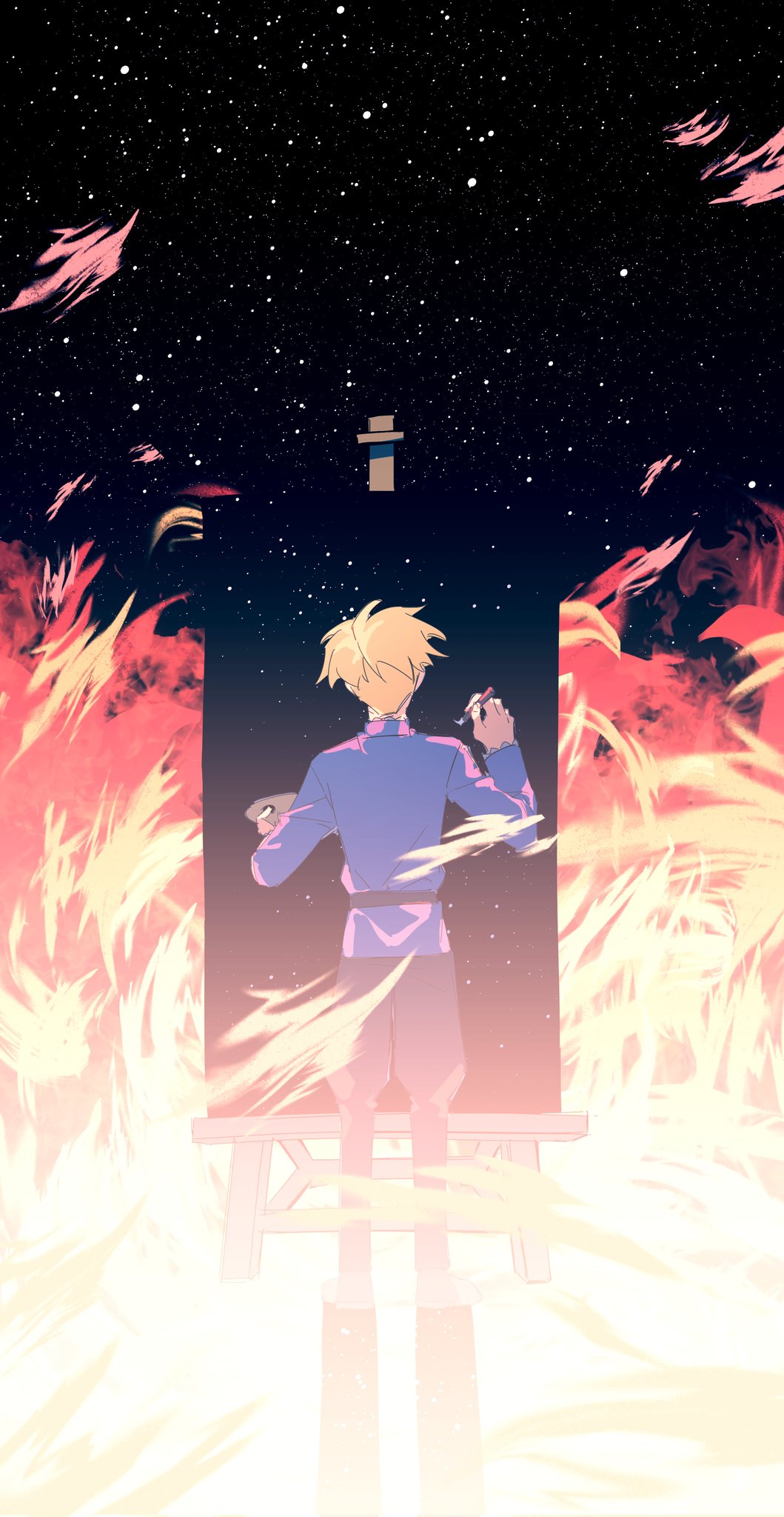 1boy belt black_belt black_pants blonde_hair blue_jacket chi.:_chikyuu_no_undou_ni_tsuite easel facing_away fiery_background fire full_body highres holding holding_paint_palette holding_paintbrush jacket k_morghania male_focus paint_palette paintbrush painting_(action) pants rafal_(chi.) short_hair sky solo standing star_(sky) starry_sky