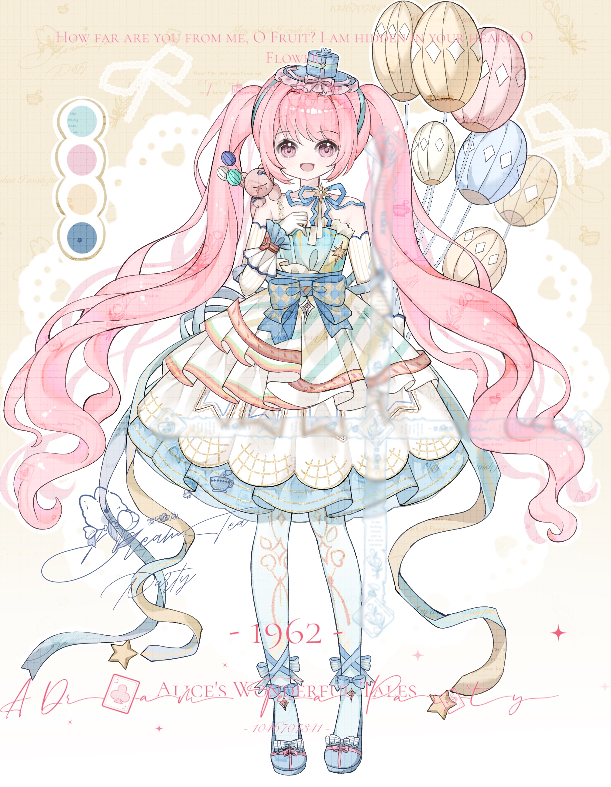 1girl absurdres ankle_bow ankle_ribbon argyle_bow artist_request back_ribbon balloon bare_shoulders blue_bow blue_dress blue_hairband blue_hat blue_pantyhose blue_ribbon blue_shoes blue_wrist_cuffs bow brooch chinese_commentary color_guide commentary_request commission dance_till_dawn_(infinity_nikki) detached_sleeves dress eyelashes frilled_dress frilled_footwear frilled_headwear frilled_wrist_cuffs frills full_body gradient_background hairband hand_on_own_chest happy hat hat_bow helena_blavatsky_(cosmo_chaldea_high_school)_(fate) helena_blavatsky_(fate) highres holding holding_balloon infinity_nikki jewelry leg_ribbon lolita_fashion long_hair long_sleeves medium_dress mini_hat mini_top_hat neck_ribbon nikki_(series) official_alternate_color open_mouth pantyhose pink_eyes pink_hair pleated_dress red_bow ribbon sample_watermark second-party_source shoes single_stripe smile solo standing star_brooch strapless strapless_dress striped_bow striped_clothes striped_dress stuffed_animal stuffed_toy tareme teddy_bear too_many_watermarks top_hat twintails two-tone_bow two-tone_dress two-tone_wrist_cuffs vertical-striped_sleeves very_long_hair waist_bow watermark wavy_hair white_dress white_sleeves white_wrist_cuffs wrist_bow wrist_cuffs yellow_background yellow_bow