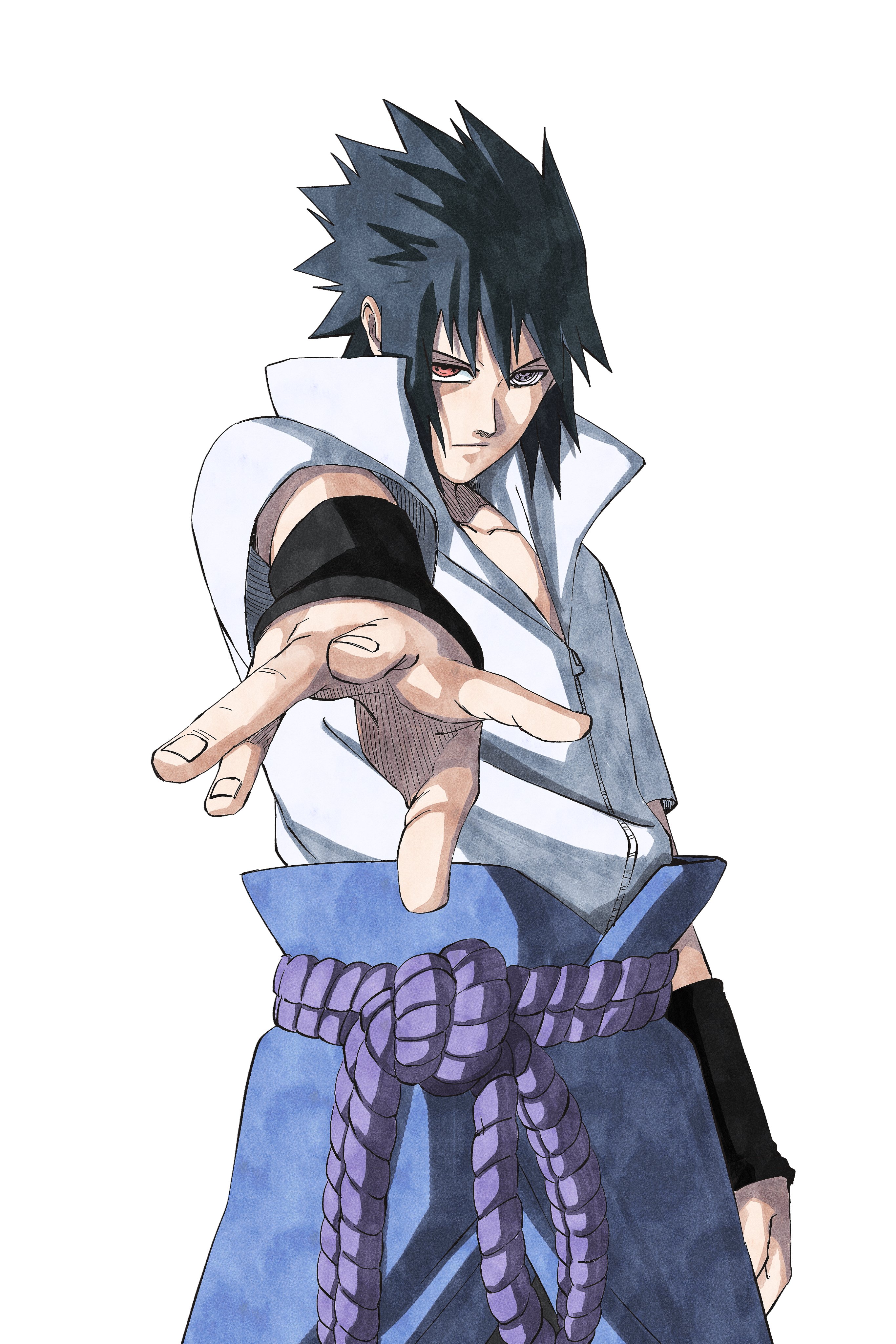 1boy absurdres beatlo_(rodrigo38658978) black_hair cowboy_shot heterochromia highres male_focus naruto_(series) naruto_shippuuden purple_eyes red_eyes rinnegan sharingan shirt solo spiked_hair uchiha_sasuke white_shirt