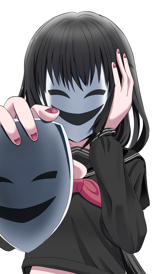 1girl black_hair black_serafuku collarbone hand_on_own_face long_sleeves mask medium_hair midriff_peek mind_control neckerchief red_nails red_neckerchief school_uniform serafuku simple_background skyblood solo sousai_shoujo_teien white_background yakushiji_kuon