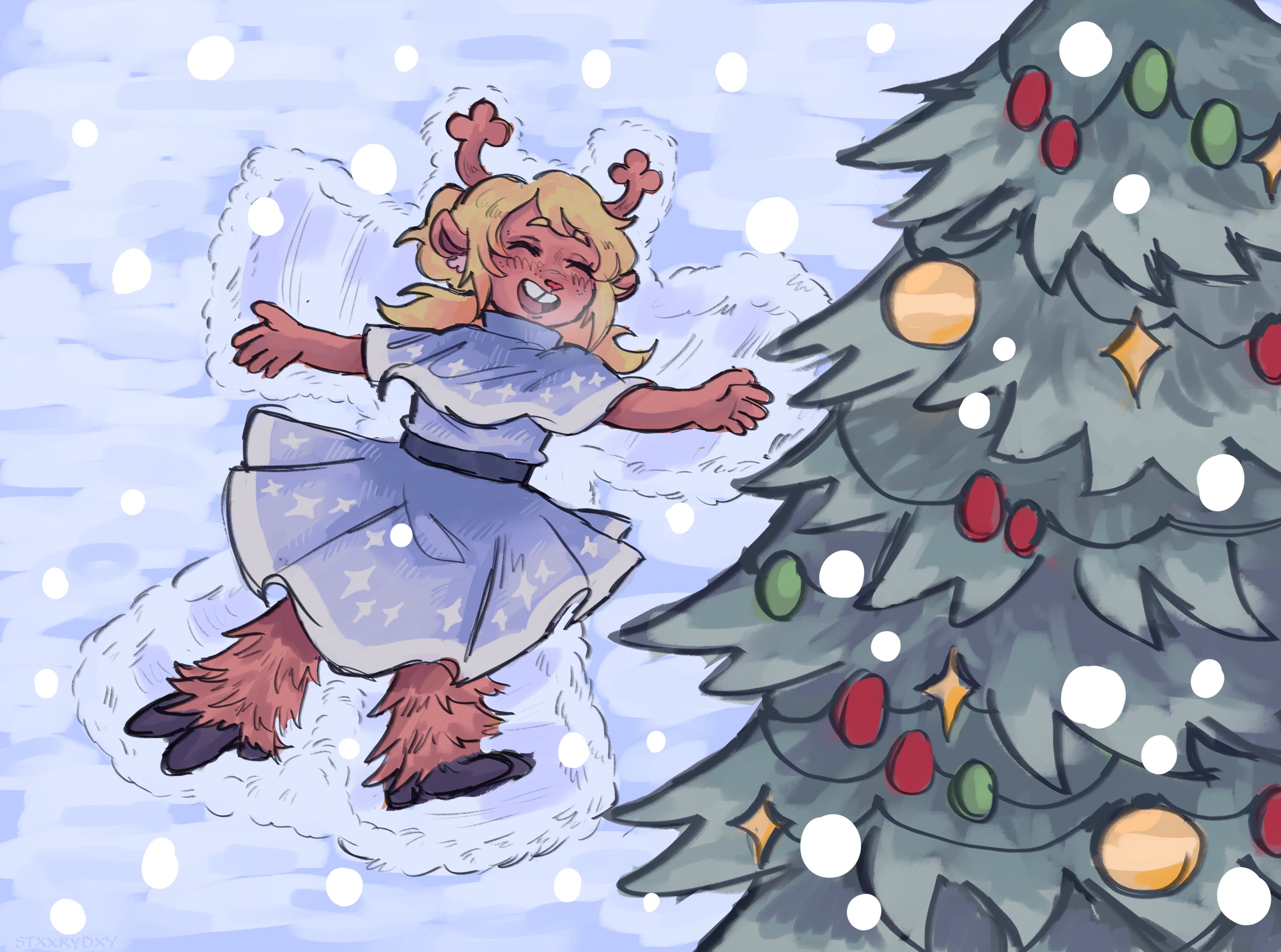 1girl absurdres antlers blonde_hair blue_capelet blue_dress brown_fur capelet christmas_ornaments christmas_tree closed_eyes commentary deer_antlers dress english_commentary furry furry_female highres hooves horns long_hair lying noelle_holiday on_back on_ground open_mouth smile snow snow_angel snowing solo stxxrydxy undertale utdr_(toby_fox)