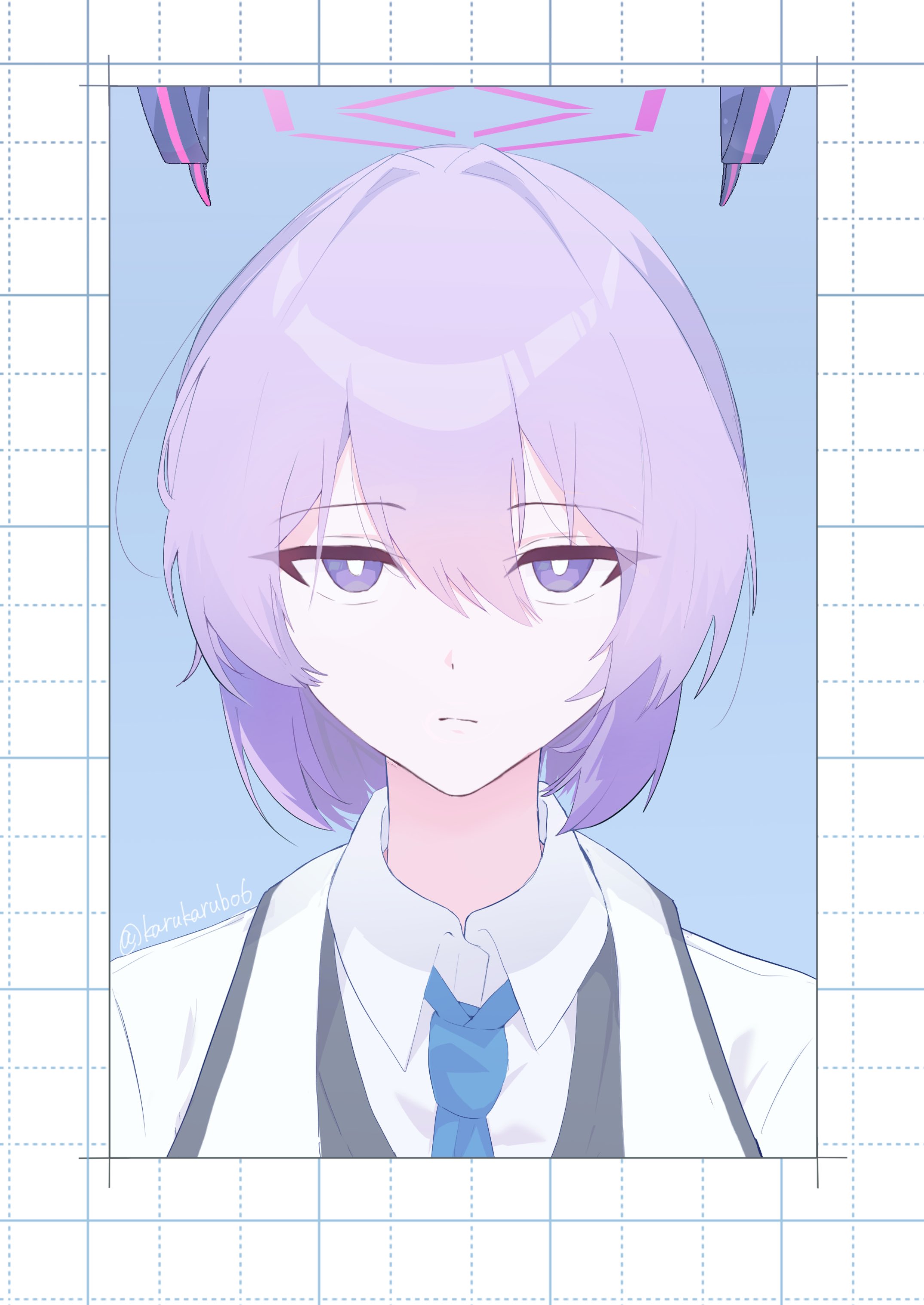 1girl absurdres blue_archive blue_background closed_mouth collared_shirt empty_eyes hair_down halo highres karubo mechanical_halo necktie portrait purple_eyes purple_hair school_uniform shirt short_hair simple_background thick_eyebrows twitter_username utaha_(blue_archive) white_shirt