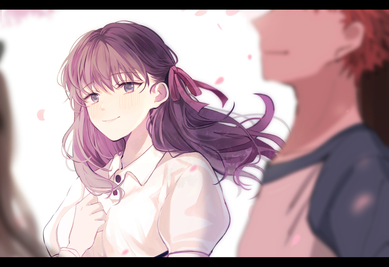 1boy 1girl blue_shirt cherry_blossoms collared_shirt dress emiya_shirou eyes_out_of_frame falling_petals fate/stay_night fate_(series) head_out_of_frame matou_sakura orange_hair petals purple_eyes purple_hair sakuya_990331 shirt short_hair short_sleeves two-tone_shirt white_dress white_shirt