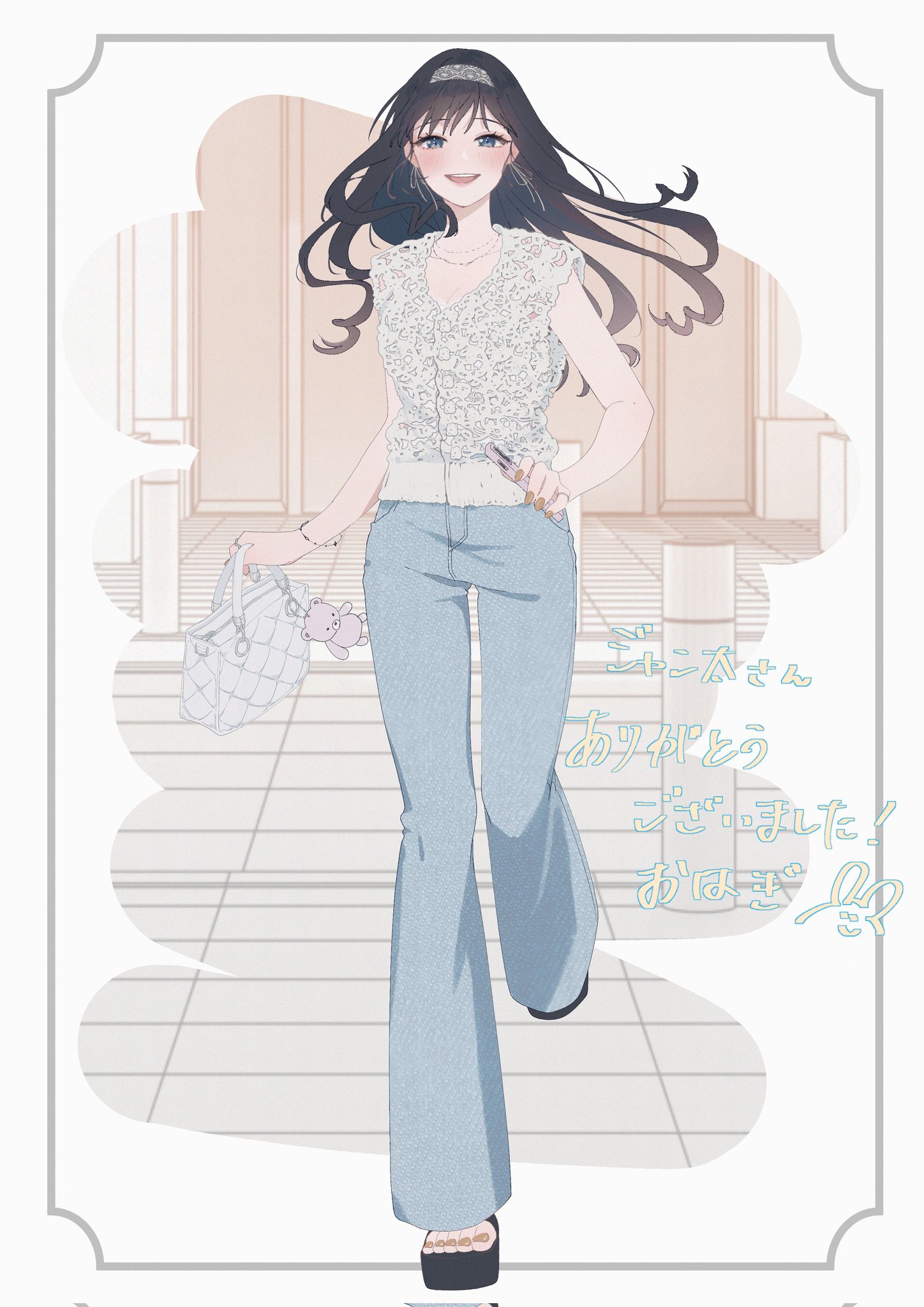 1girl alternate_costume amagami bag bag_charm blush border bracelet breasts charm_(object) cleavage collarbone commentary_request commission commissioner_upload denim earrings full_body hairband highres holding holding_bag holding_phone jeans jewelry looking_at_viewer morishima_haruka nail_polish necklace open_mouth outside_border pants phone platform_sandals print_hairband running sandals second-party_source shirt sleeveless sleeveless_shirt smile solo thank_you toenail_polish toenails toes umeumemuseum white_hairband white_shirt yellow_nails