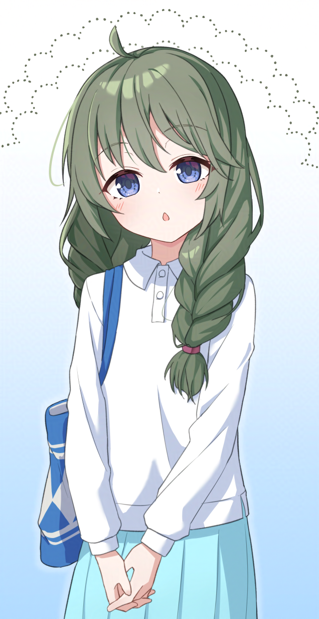 1girl ahoge bag blue_background blue_eyes blue_skirt blush braid chestnut_mouth collared_shirt commentary_request gradient_background hair_between_eyes hair_over_shoulder highres long_hair long_sleeves looking_at_viewer low_twintails nenosame own_hands_together parted_lips pleated_skirt polo_shirt princess_connect! puffy_long_sleeves puffy_sleeves shirt skirt solo twin_braids twintails white_background white_shirt yuni_(princess_connect!) yuni_(real)_(princess_connect!)