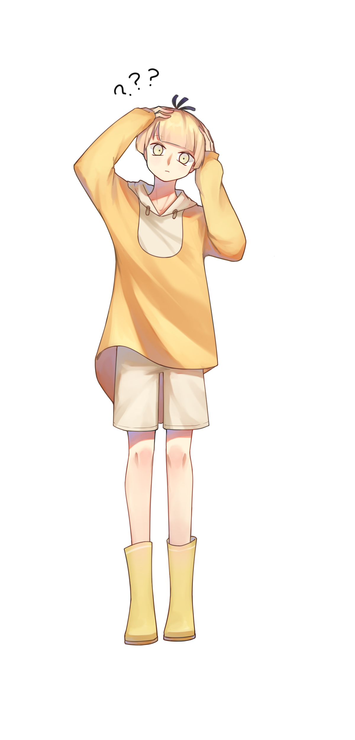 1boy ? ?? absurdres arms_up blonde_hair boots bowl_cut brown_shorts full_body gen_1_pokemon highres male_focus nintendo personification pokemon psyduck rubber_boots shirt shorts simple_background solo sunuo_de_justwe_zidong_shou_huoji white_background yellow_boots yellow_eyes yellow_shirt