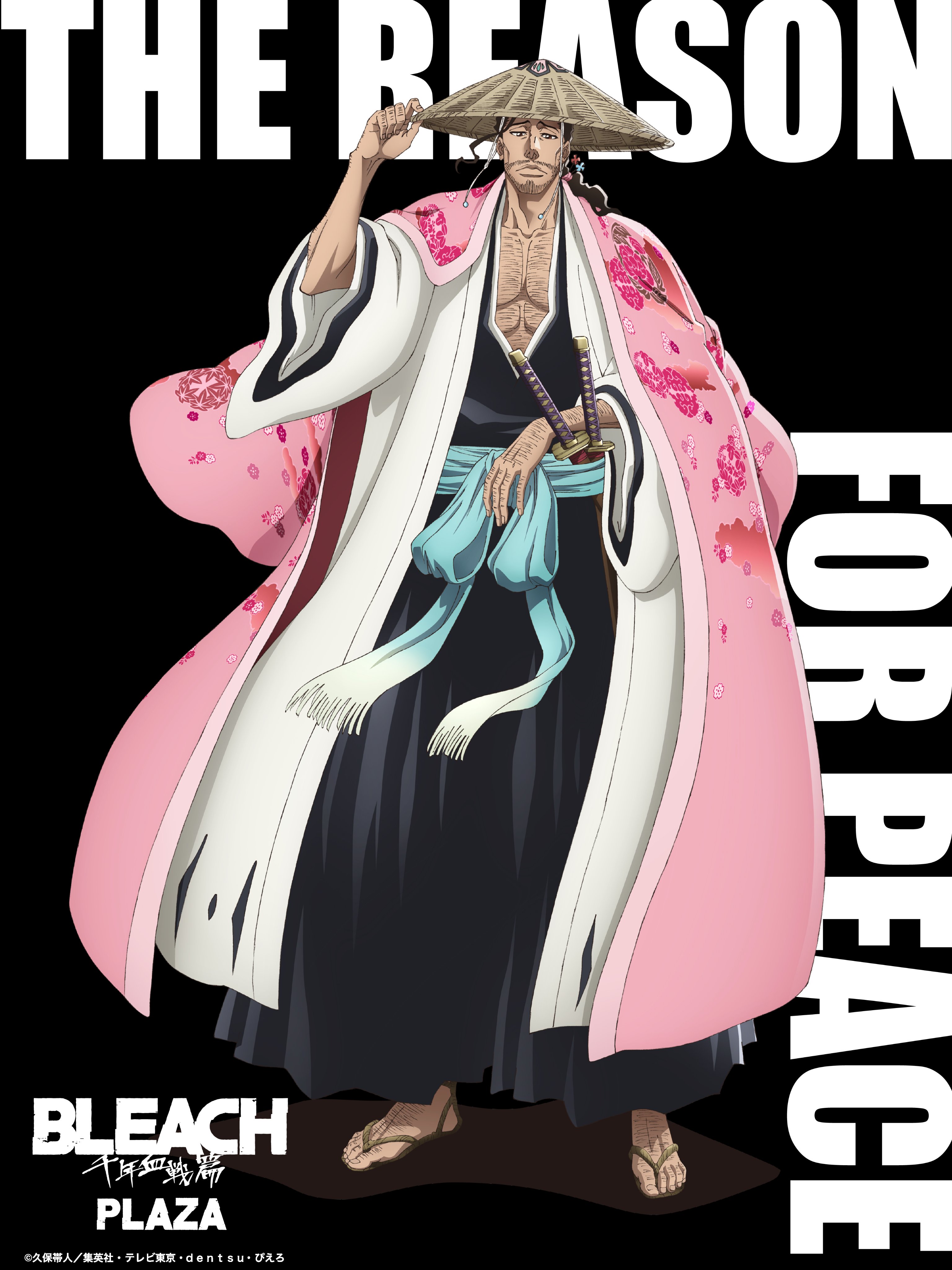1boy absurdres black_background bleach bleach:_sennen_kessen-hen brown_hair chest_hair collarbone copyright_name english_text full_body hair_ornament hairpin haori hat highres japanese_clothes japanese_text kimono kyouraku_shunsui long_hair male_focus official_art ponytail promotional_art shihakusho simple_background solo solo_focus straw_hat sugegasa sword weapon wide_sleeves zanpakutou