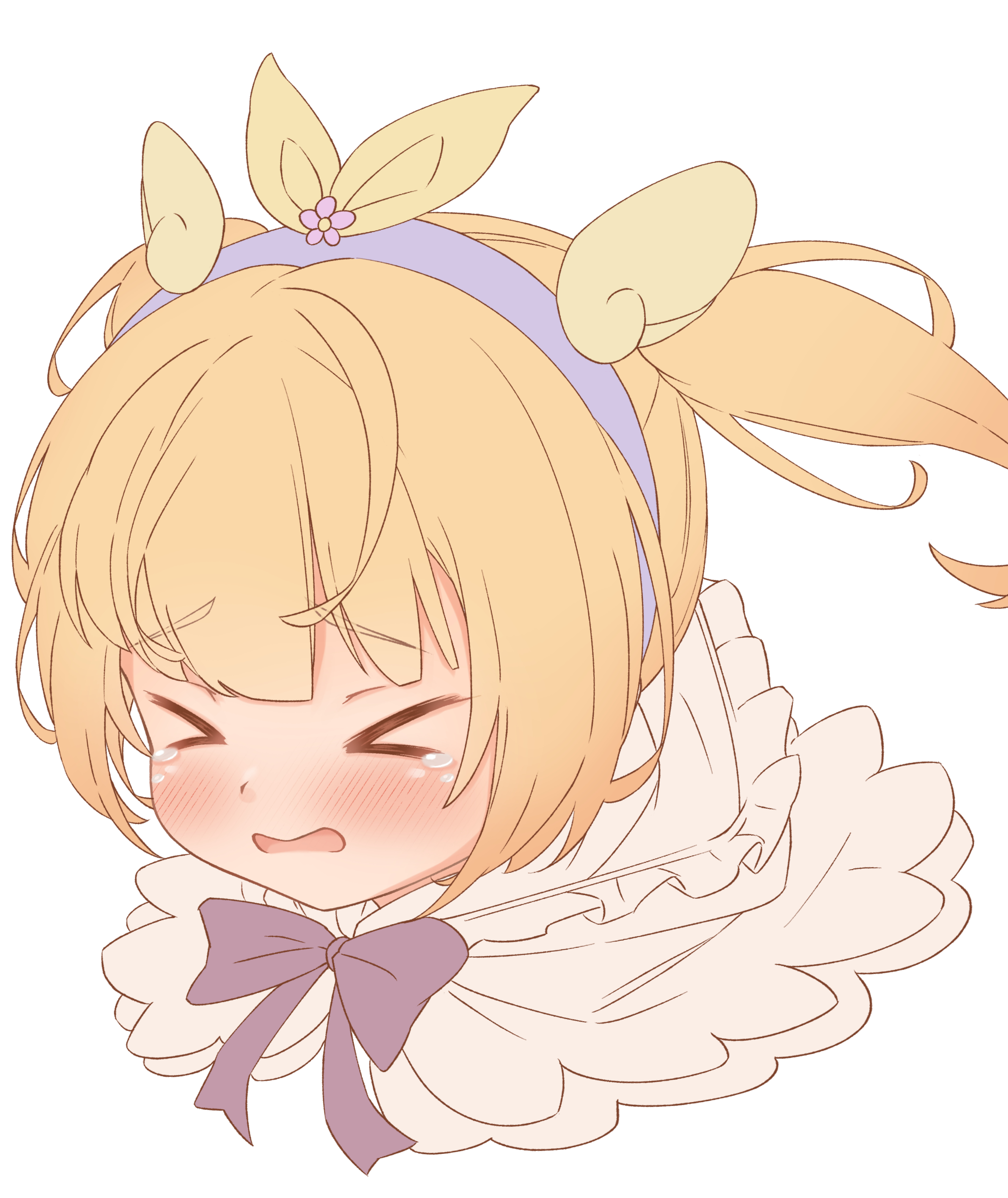 >_< 1girl absurdres black_ribbon blonde_hair blue_hairband blush capelet child cococco_alma cropped_shoulders emil_chronicle_online frilled_capelet frills hair_ornament hairband highres neck_ribbon open_mouth ribbon short_twintails silver-index solo tearing_up twintails white_capelet wing_hair_ornament