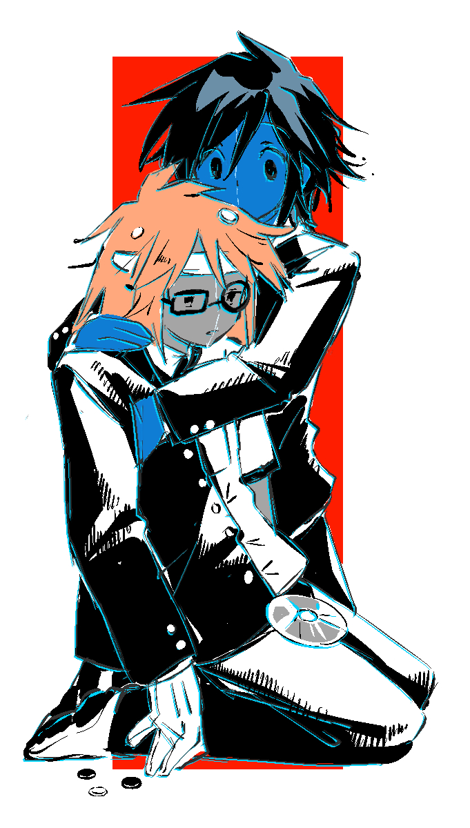 2boys asymmetrical_clothes black_hair black_jacket blue_skin cd colored_skin commentary_request cracked_skin gakuran glasses grey_skin highres jacket looking_at_another male_focus multiple_boys open_clothes open_jacket orange_hair orochi_moko randal's_friends randal_ivory red_background school_uniform short_hair simple_background tsukada_satoru