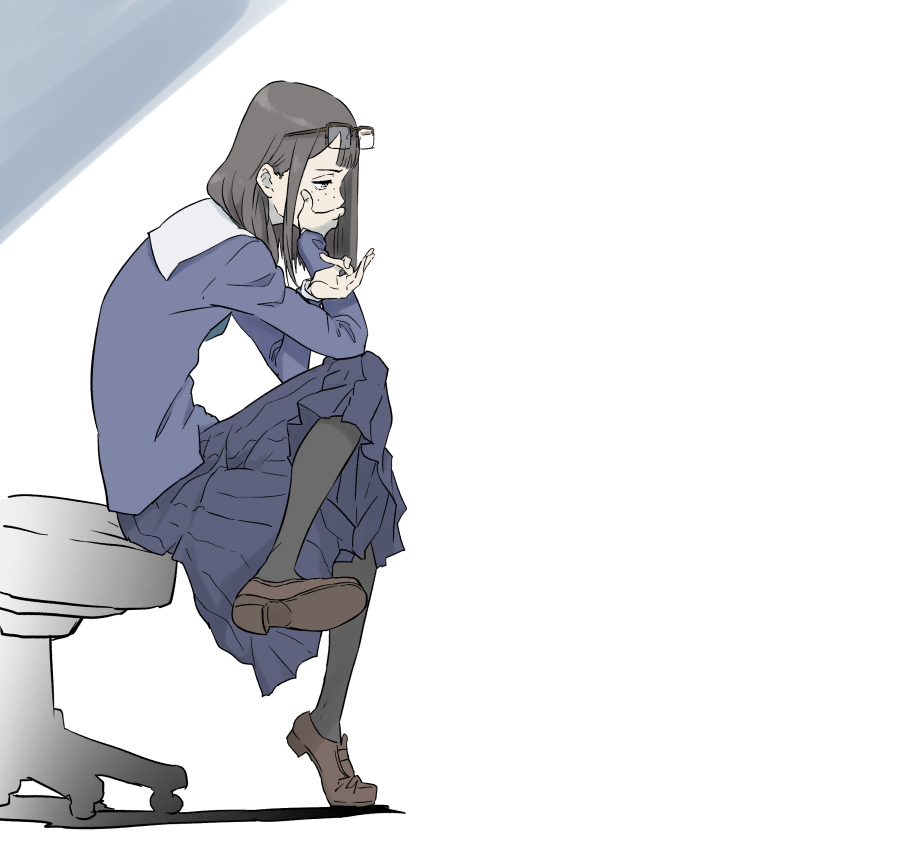 1girl asymmetrical_bangs black_hair commentary eizouken_ni_wa_te_wo_dasu_na! eyewear_on_head freckles from_side glasses henriiku_(ahemaru) kanamori_sayaka long_hair school_uniform shibahama_high_school_uniform skirt solo