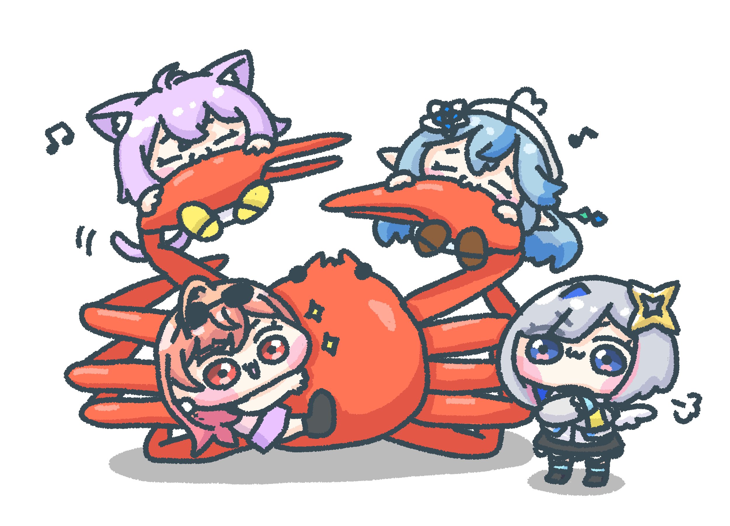 4girls :3 ahoge amane_kanata animal animal_ear_fluff animal_ears blue_eyes blue_hair blush_stickers cat_ears cat_girl cat_tail chibi chibi_only climbing commentary_request crab crossed_arms eating eyewear_on_head flower food grey_hair hair_flower hair_ornament heart heart_ahoge highres hololive hololive_dev_is ichijou_ririka isapi_(sslm_pipipi) long_hair mini_wings motion_lines multiple_girls musical_note nekomata_okayu orange_hair puff_of_air purple_hair red_eyes short_hair shuriken_hair_ornament sparkle spoken_musical_note standing tail virtual_youtuber white_background wings yukihana_lamy