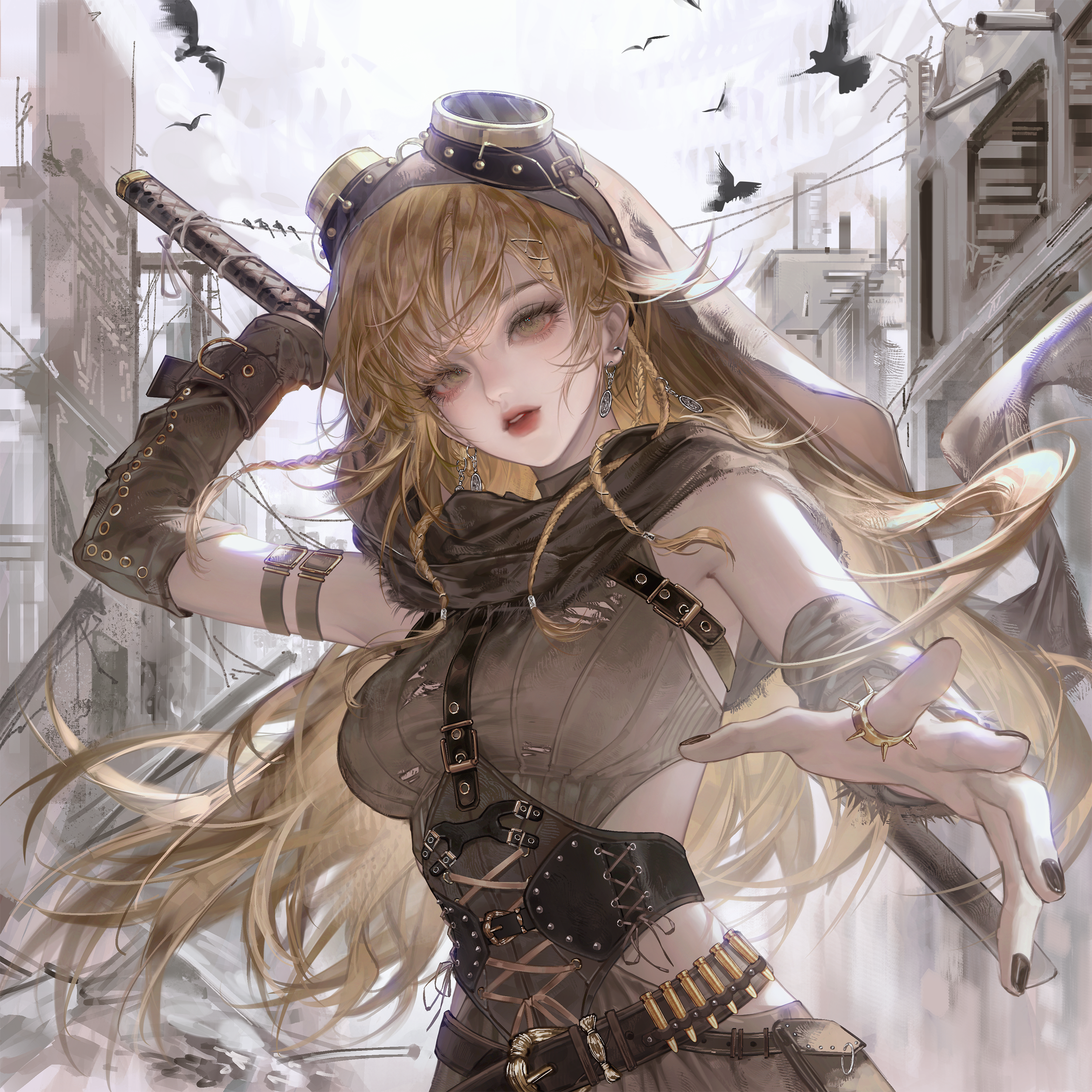1girl absurdres belt bird black_nails blonde_hair breasts corset earrings gloriash gloves goggles goggles_on_head highres holding holding_weapon jewelry large_breasts long_hair looking_at_viewer nail_polish open_mouth original outdoors ring scarf single_glove solo upper_body weapon