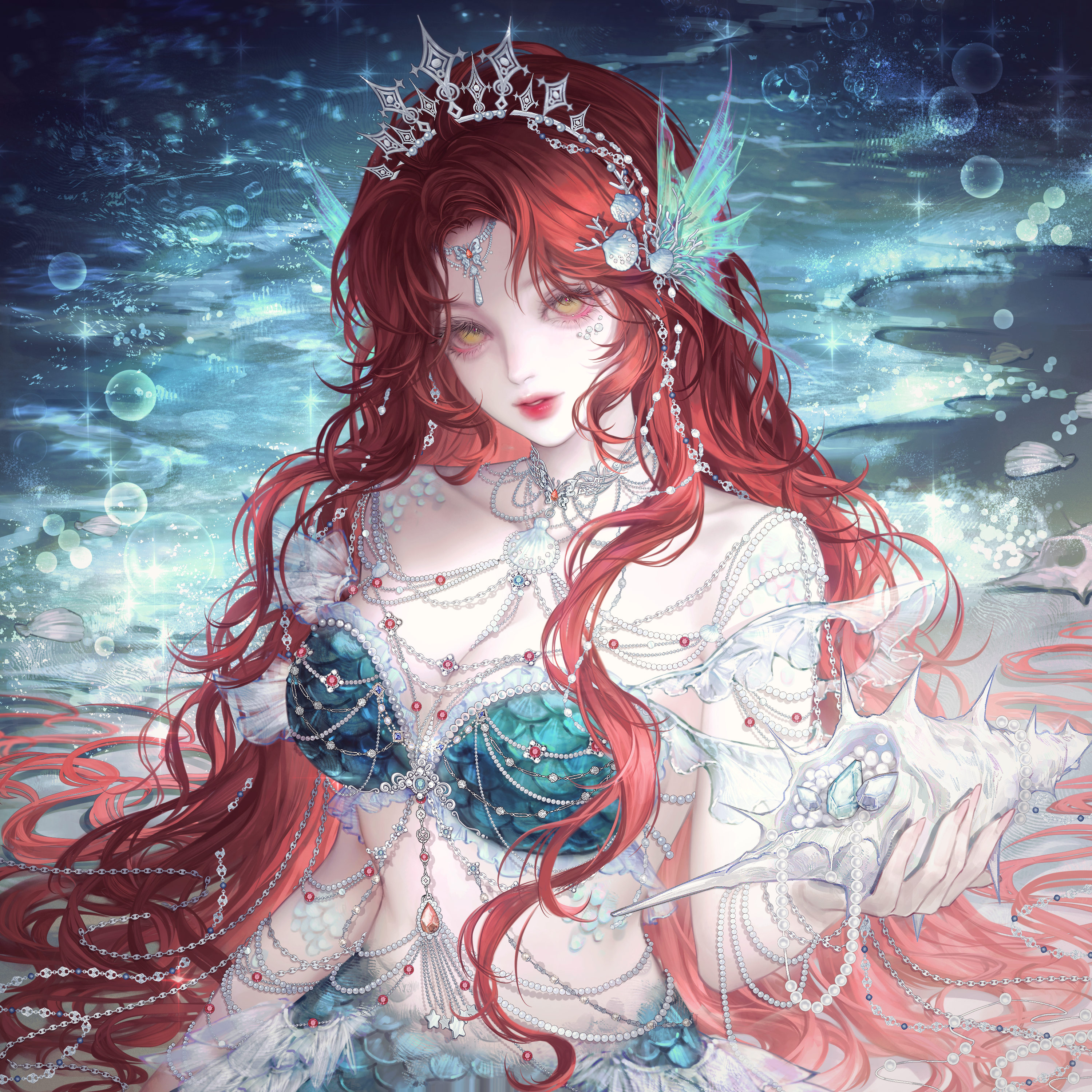 1girl absurdres bubble gloriash hair_ornament highres jewelry long_hair mermaid monster_girl necklace original pearl_gemstone pearl_necklace red_hair seashell shell solo upper_body water yellow_eyes