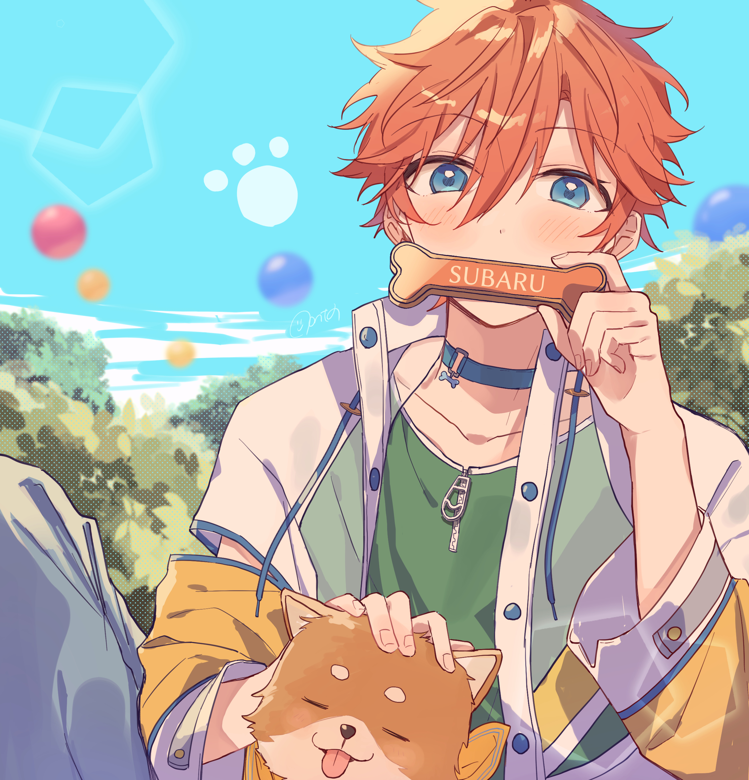 1boy absurdres akehoshi_subaru blue_choker blue_eyes blue_sky blurry blurry_background blush bone character_name choker daikichi_(ensemble_stars!) dog ensemble_stars! hair_between_eyes highres holding holding_bone jacket looking_at_viewer male_focus open_clothes open_jacket orange_hair outdoors paw_print petting short_hair sky solo zu_tonatuyasumi