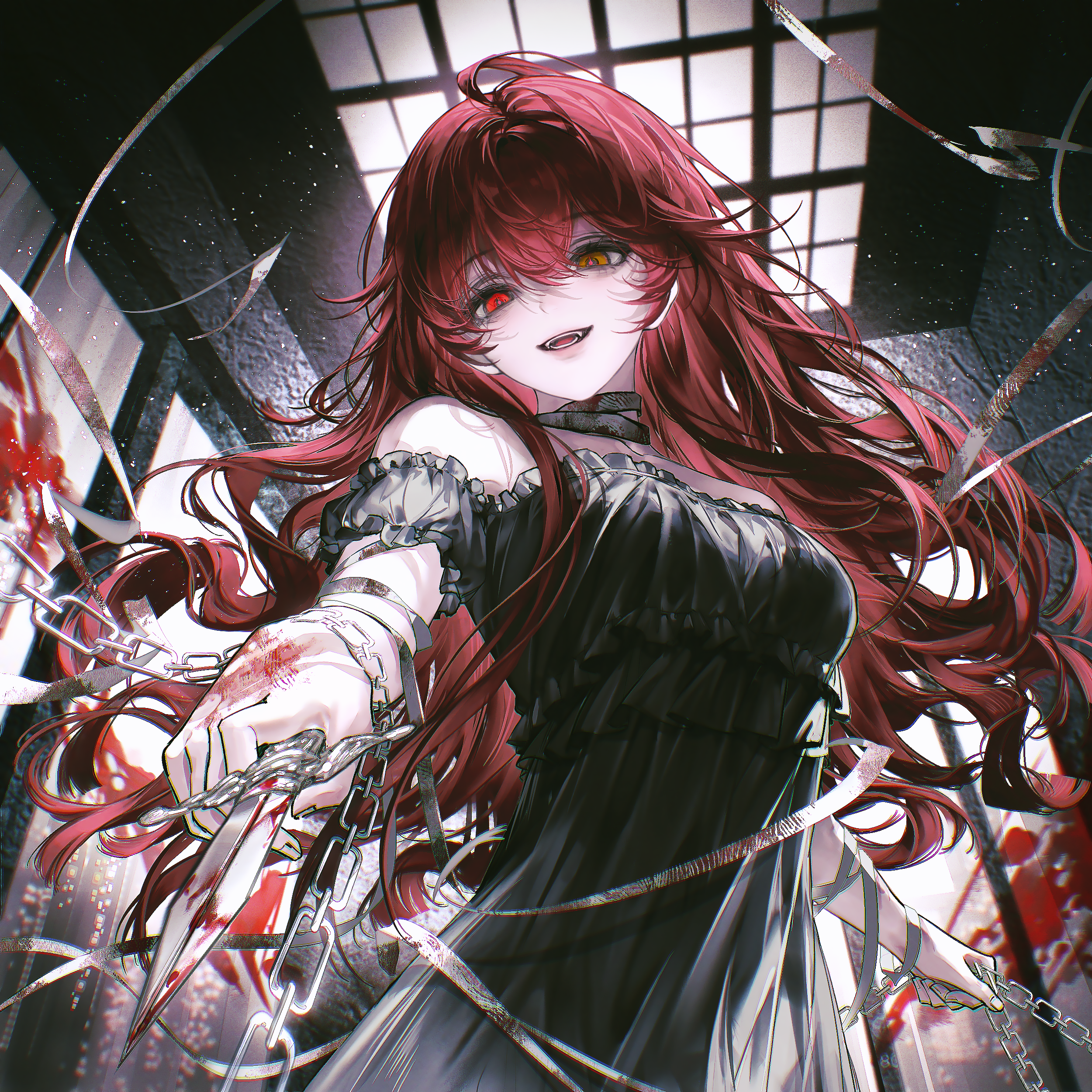 1girl absurdres ahoge bare_shoulders black_dress blood breasts chain choker dress fangs gloriash hair_between_eyes heterochromia highres long_hair looking_at_viewer open_mouth original red_eyes red_hair smile solo window yellow_eyes
