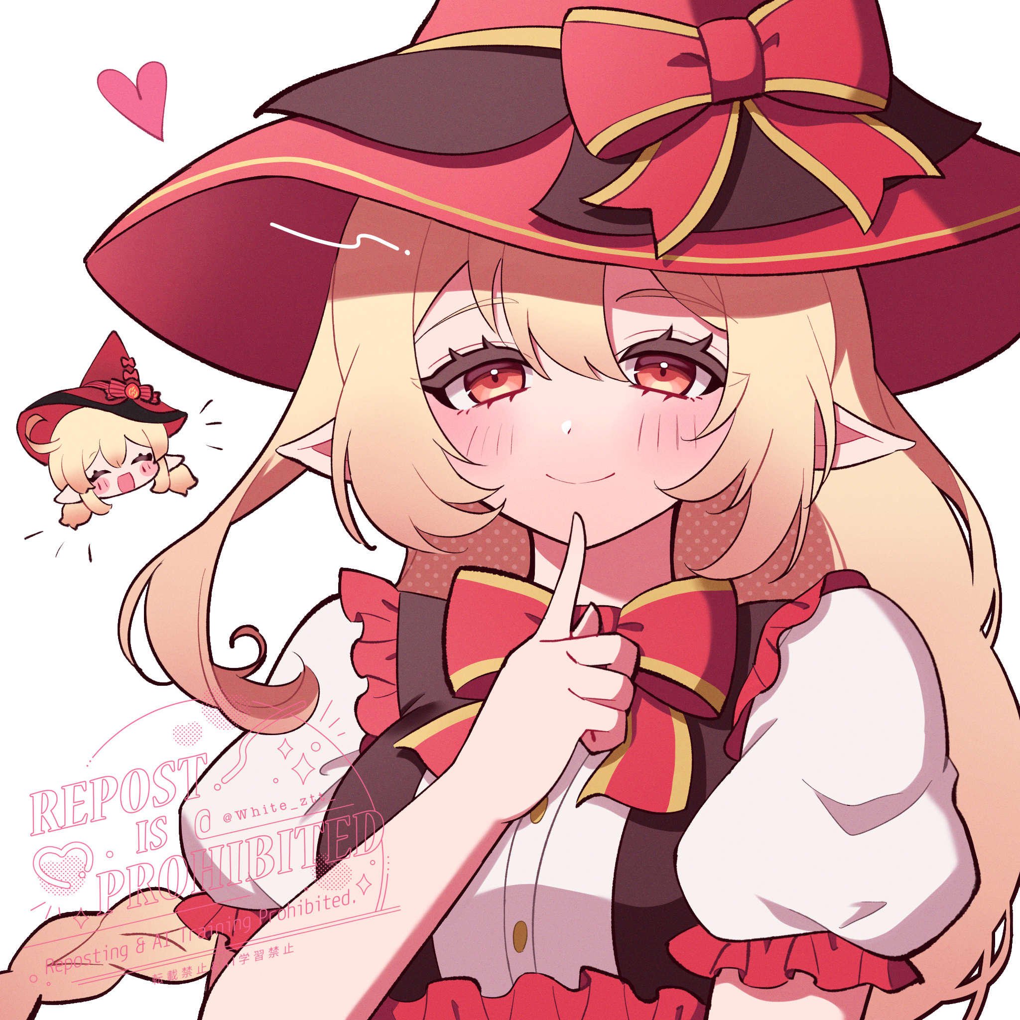 2girls alice_(genshin_impact) alice_(prelude_to_moonlight)_(genshin_impact) arm_at_side blonde_hair blush bow bowtie braid buttons chibi chibi_inset closed_mouth commentary_request cropped_head double-parted_bangs finger_to_mouth frilled_sleeves frills genshin_impact hair_between_eyes hand_up hat hat_bow heart highres index_finger_raised klee_(blossoming_starlight)_(genshin_impact) klee_(genshin_impact) long_hair looking_at_viewer low-braided_long_hair low-tied_long_hair mother_and_child mother_and_daughter multiple_girls parent_and_child pointy_ears portrait puffy_short_sleeves puffy_sleeves red_bow red_bowtie red_eyes red_hat shirt short_sleeves short_twintails side_ahoge simple_background smile straight-on tareme twintails watermark white_background white_shirt white_ztt witch_hat