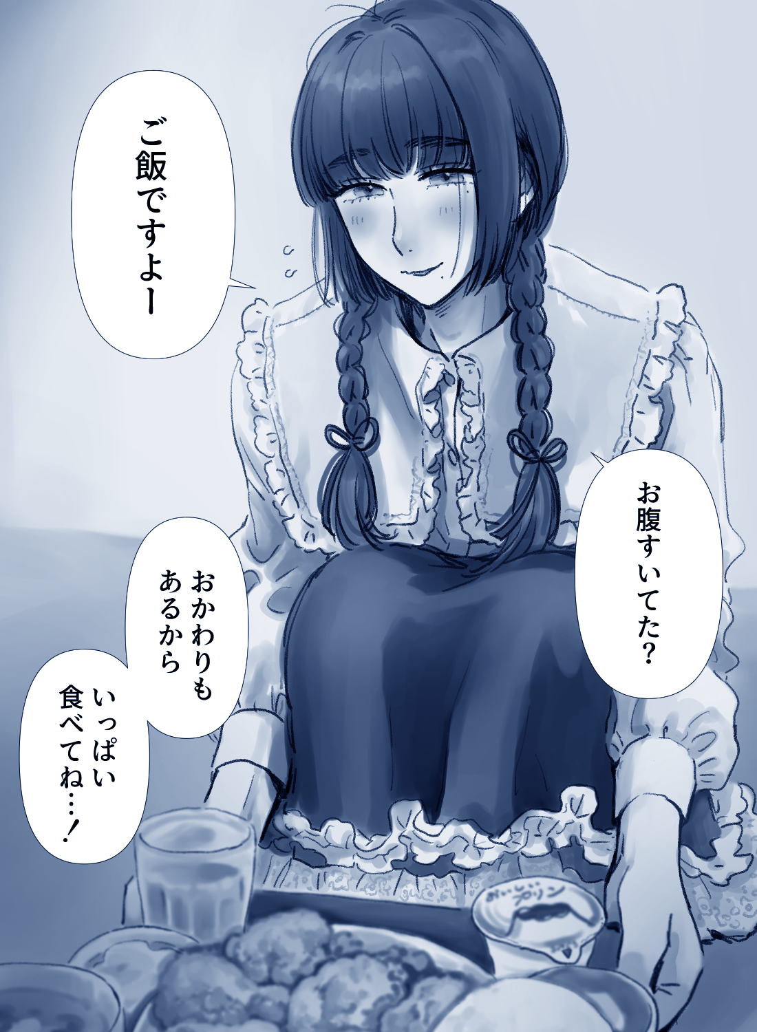 1boy arisa_(yuki_touko) blue_theme blunt_bangs blush braid commentary_request crossdressing crossdressing_(mtf) cup drinking_glass food frilled_shirt_collar frilled_skirt frills highres holding holding_tray knees_up long_skirt male_focus mole mole_under_eye mole_under_mouth monochrome original parted_lips skirt smile speech_bubble squatting translation_request trap tray twin_braids yuki_touko