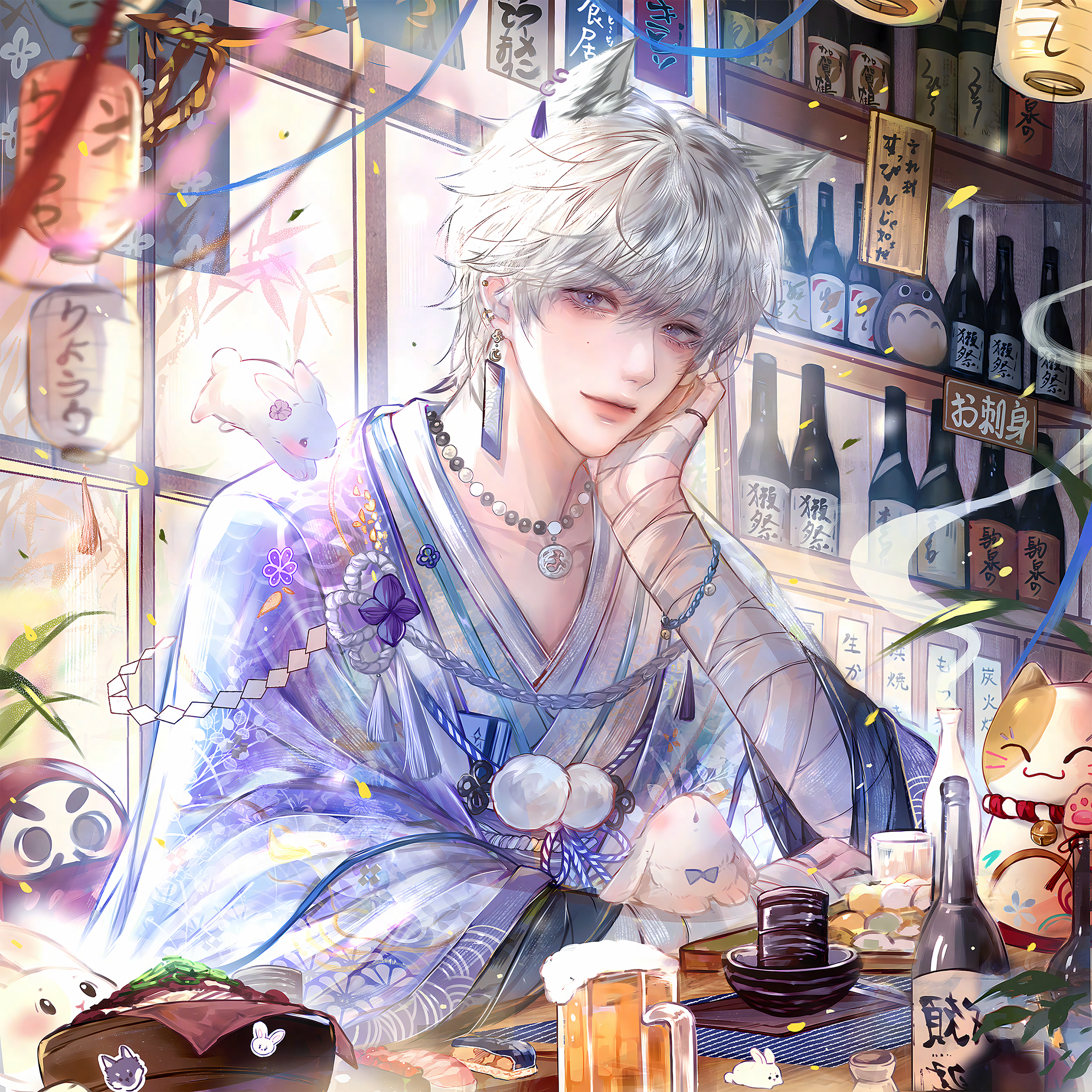 1boy absurdres alcohol animal_ears blue_eyes cup earrings food highres japanese_clothes jewelry large_variant_set looking_at_viewer male_focus necklace original qingluanluan variant_set white_hair