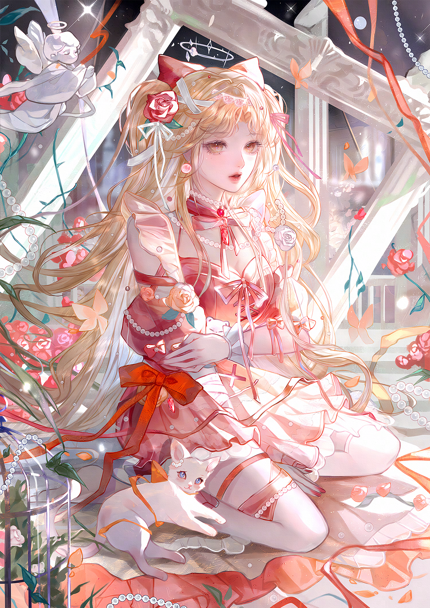1girl beads blonde_hair bow bug butterfly cat dress flower frills hair_flower hair_ornament highres insect jewelry large_variant_set long_hair looking_at_viewer necklace original pearl_gemstone pearl_necklace pillar pink_dress qingluanluan red_bow red_flower ribbon rose sitting solo variant_set wariza white_cat white_flower white_rose