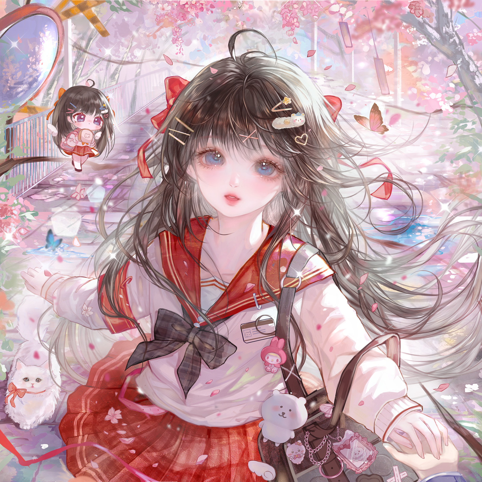 1girl ahoge bag black_hair blue_eyes bow bug butterfly cherry_blossoms chibi hair_bow hair_ornament hairclip highres insect long_hair long_sleeves looking_at_viewer original qingluanluan red_skirt sailor_collar school_uniform serafuku skirt