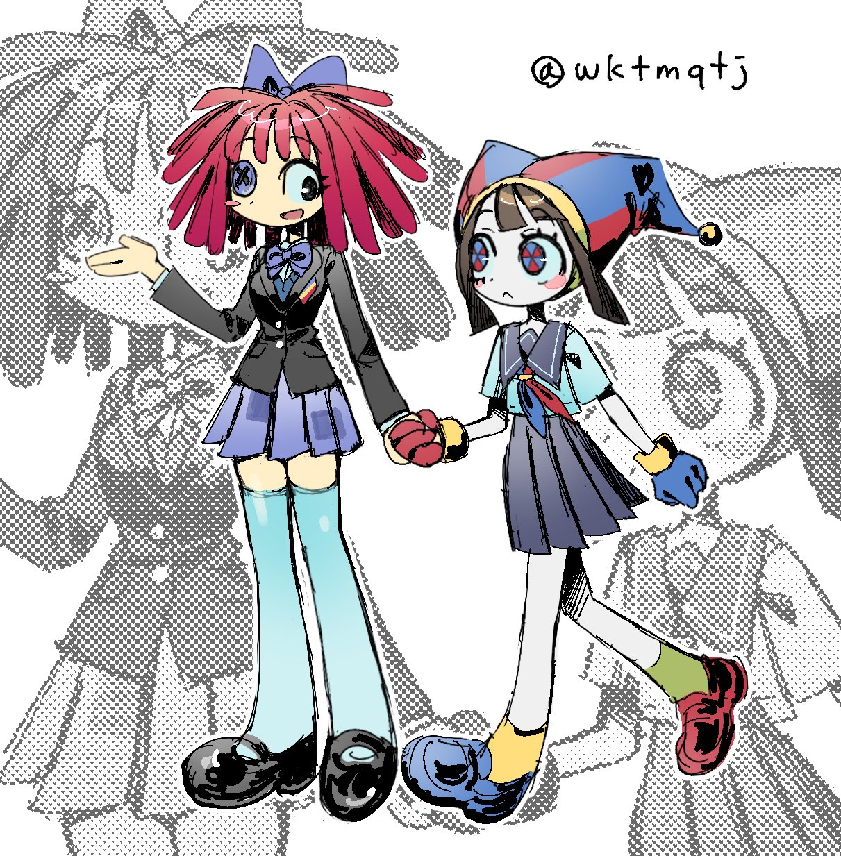 2girls :< :d ankle_boots asymmetrical_footwear bare_legs black_eyes black_jacket black_sailor_collar black_shoes black_skirt blue_eyes blue_gloves blue_hat blue_shirt blue_shoes blue_sweater blue_thighhighs blunt_bangs blush_stickers boots bow bowtie breasts brown_hair buttons closed_mouth collared_shirt colored_skin fewer_digits flat_chest full_body gloves hair_bow halftone halftone_background hat high-waist_skirt highres holding_hands jacket jester_cap layered_sleeves loafers long_sleeves looking_at_another mary_janes medium_breasts medium_hair miniskirt mismatched_footwear multicolored_eyes multiple_girls official_alternate_costume open_mouth outline pleated_skirt pomni_(the_amazing_digital_circus) purple_bow purple_bowtie purple_skirt ragatha_(the_amazing_digital_circus) red_bow red_eyes red_gloves red_hat red_shoes sailor_collar school_uniform shirt shoes short_hair short_sleeves simple_background single_blush_sticker skirt smile socks standing standing_on_one_leg striped_clothes striped_hat striped_headwear sweater the_amazing_digital_circus thighhighs twitter_username two-tone_eyes two-tone_hat two-tone_headwear vertical-striped_clothes vertical-striped_headwear walking white_background white_outline white_shirt white_skin wktmqtj yellow_socks zettai_ryouiki zoom_layer
