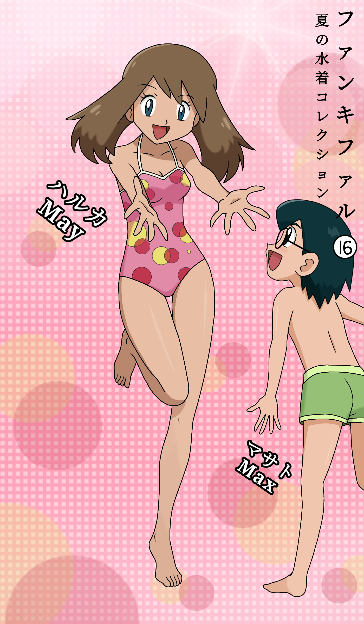 1boy 1girl absurdres arm_at_side back barefoot black_hair blue_eyes breasts brother_and_sister brown_hair casual_one-piece_swimsuit character_name child cleavage collarbone eyelashes fankifalu feet female_focus from_behind full_body glasses green_swim_trunks halterneck happy height_difference highres incoming_hug japanese_text knees legs looking_at_another looking_up male_swimwear max_(pokemon) may_(pokemon) medium_hair neck nintendo official_alternate_costume official_style one-piece_swimsuit open_hands open_mouth outstretched_arms pink_background pink_one-piece_swimsuit pokemon pokemon_(anime) pokemon_ag019 pokemon_the_series:_ruby_and_sapphire polka_dot polka_dot_swimsuit profile short_hair siblings sidelocks small_breasts standing standing_on_one_leg swept_bangs swim_trunks swimsuit thigh_gap thighs tiptoes toes translation_request unworn_bandana