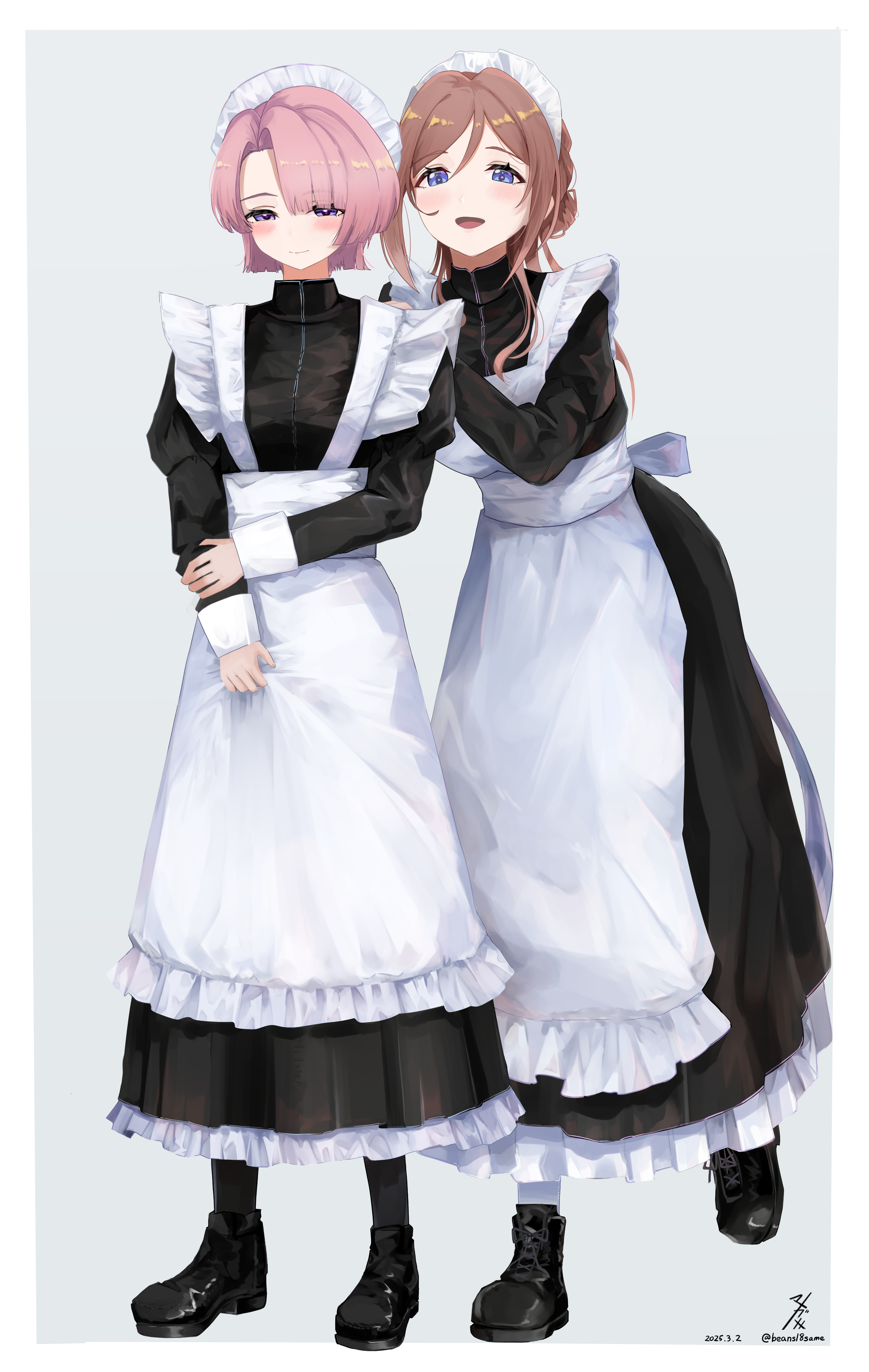 2girls absurdres alternate_costume apron arimura_mao beans18mame black_dress black_shoes blush border brown_hair dress enmaided frilled_apron frills full_body gakuen_idolmaster highres himesaki_rinami idolmaster juliet_sleeves long_sleeves looking_at_viewer maid maid_apron maid_headdress multiple_girls pink_hair puffy_sleeves shoes simple_background smile twitter_username white_apron white_border