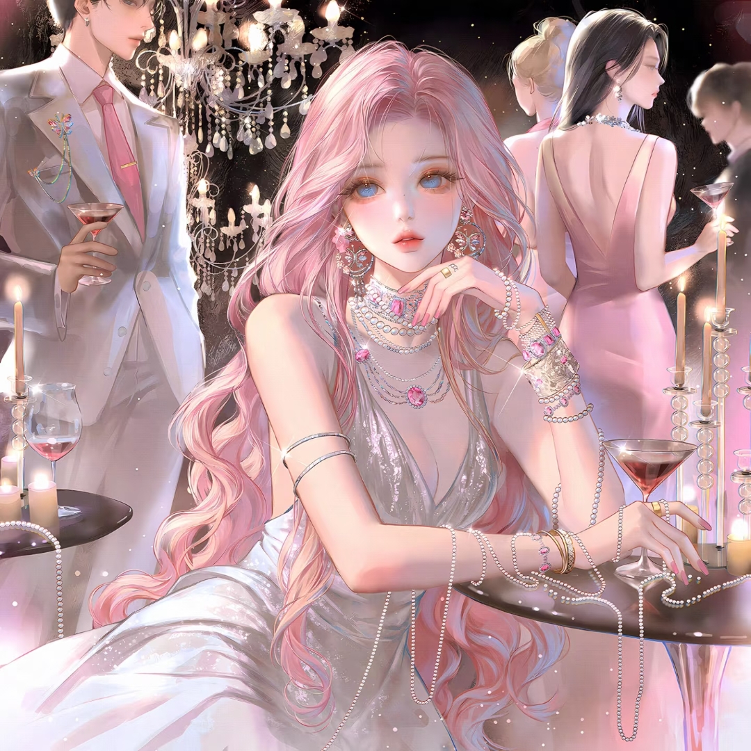 1boy 3girls alcohol bare_shoulders beads black_hair blonde_hair blue_eyes bracelet breasts candle chandelier cleavage cup dress drinking_glass earrings faceless formal_clothes holding jacket jewelry large_variant_set long_hair looking_at_viewer medium_breasts multiple_girls nail_polish necklace necktie original parted_lips pearl_necklace pink_dress pink_hair pink_nails pink_necktie ring shirt sitting sleeveless sleeveless_dress solo_focus suit table variant_set wavy_hair white_dress wine_glass xixizi
