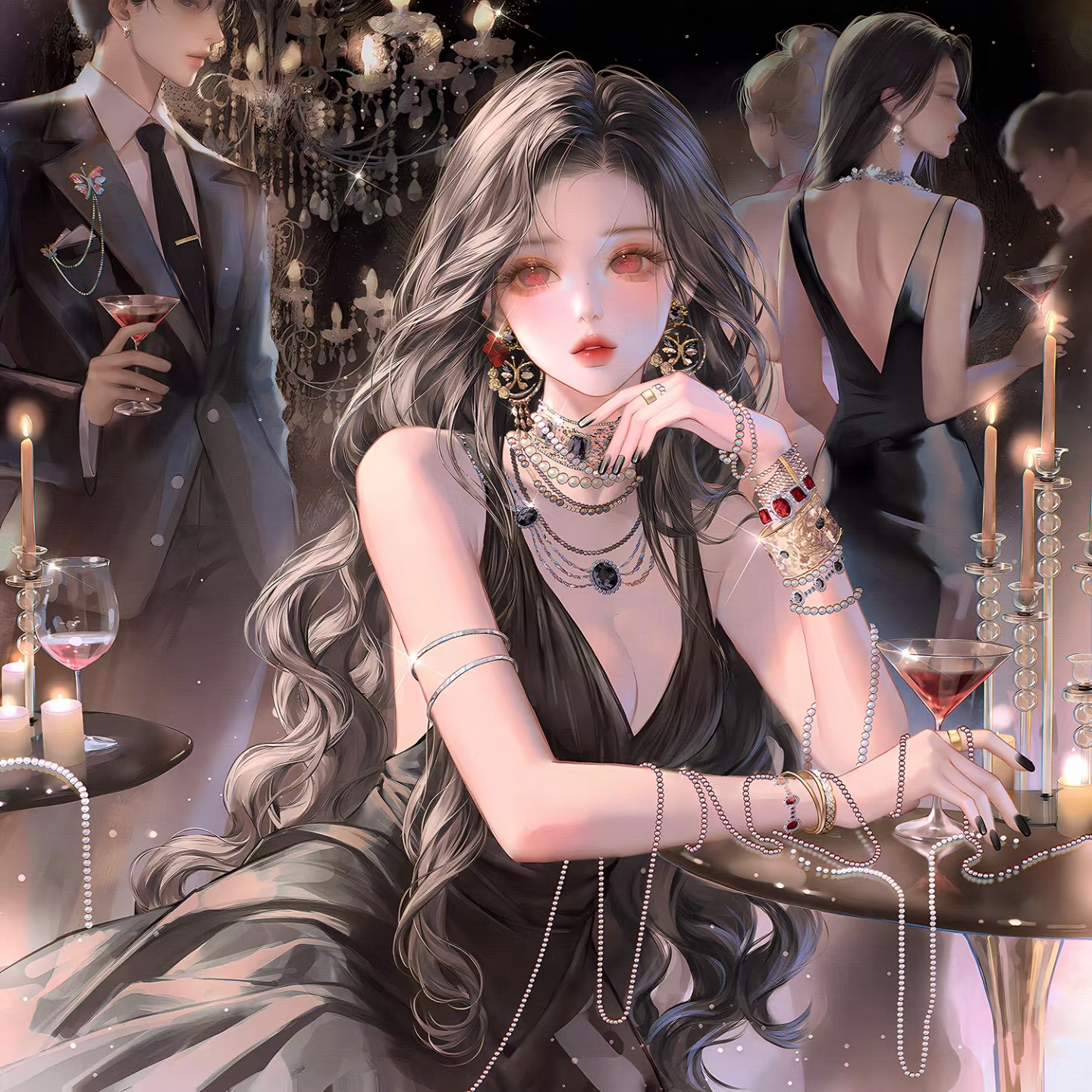 1girl alcohol bare_shoulders beads black_dress black_hair black_nails bracelet breasts candle chandelier cleavage cup dress drinking_glass earrings evening_gown formal_clothes highres holding jewelry large_variant_set long_hair looking_at_viewer medium_breasts mole multiple_boys multiple_girls nail_polish necklace necktie original parted_lips red_eyes ring sitting solo_focus suit table variant_set wavy_hair wine_glass xixizi