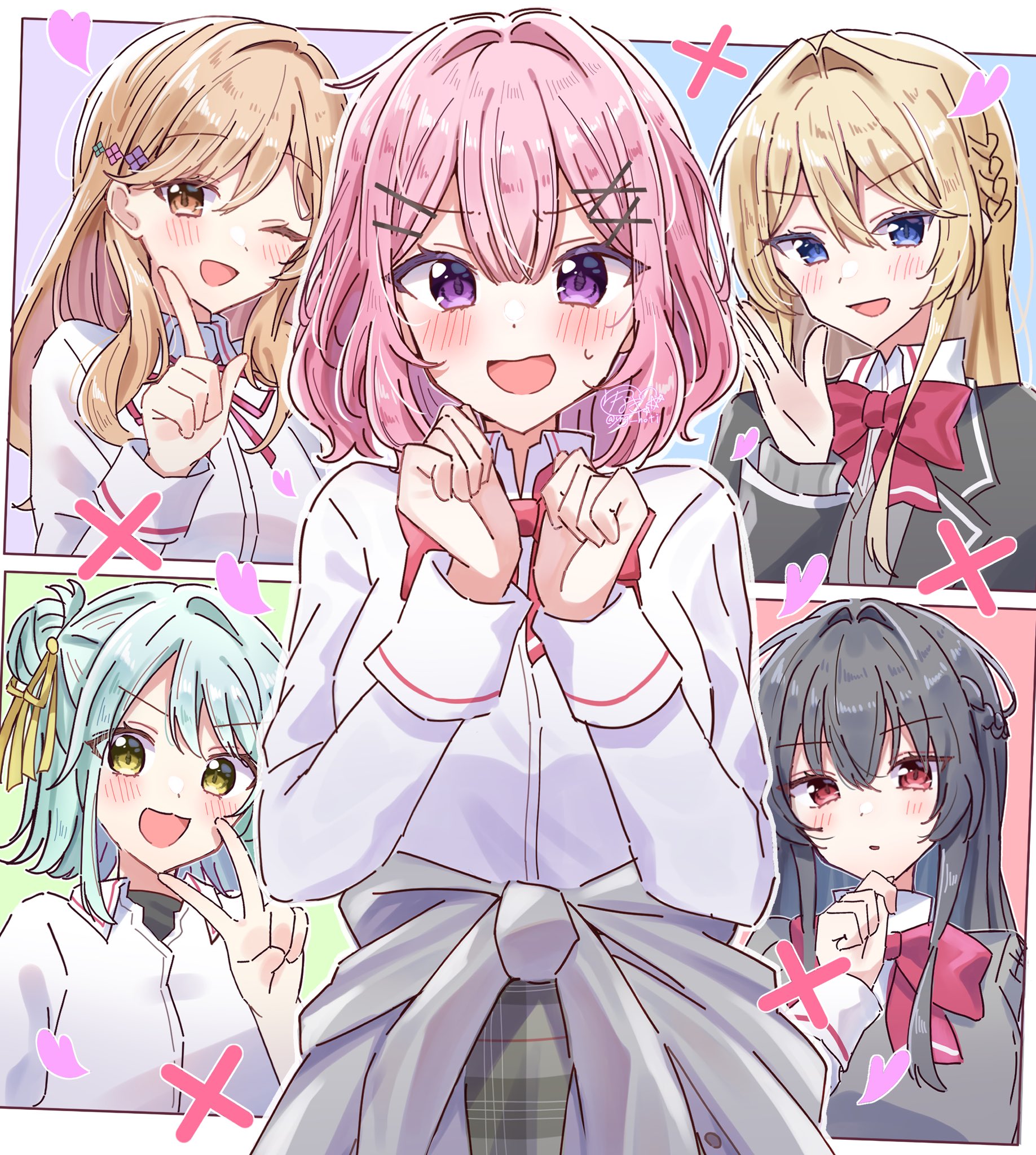 5girls amaori_renako aqua_hair ashigaya_high_school_uniform black_hair blonde_hair blush braid brown_hair cardigan cardigan_around_waist clothes_around_waist hair_between_eyes hair_bun hair_intakes hair_ornament hairclip hand_on_own_chin heart highres koto_satsuki koyanagi_kaho long_hair multiple_girls one_eye_closed ouzuka_mai parallel_hairclips pink_hair school_uniform sena_ajisai short_hair sidelocks single_hair_bun smile sweatdrop sweater_vest swept_bangs v watashi_ga_koibito_ni_nareru_wake_naijan_murimuri! x_hair_ornament yunagi_(yng_hoti)