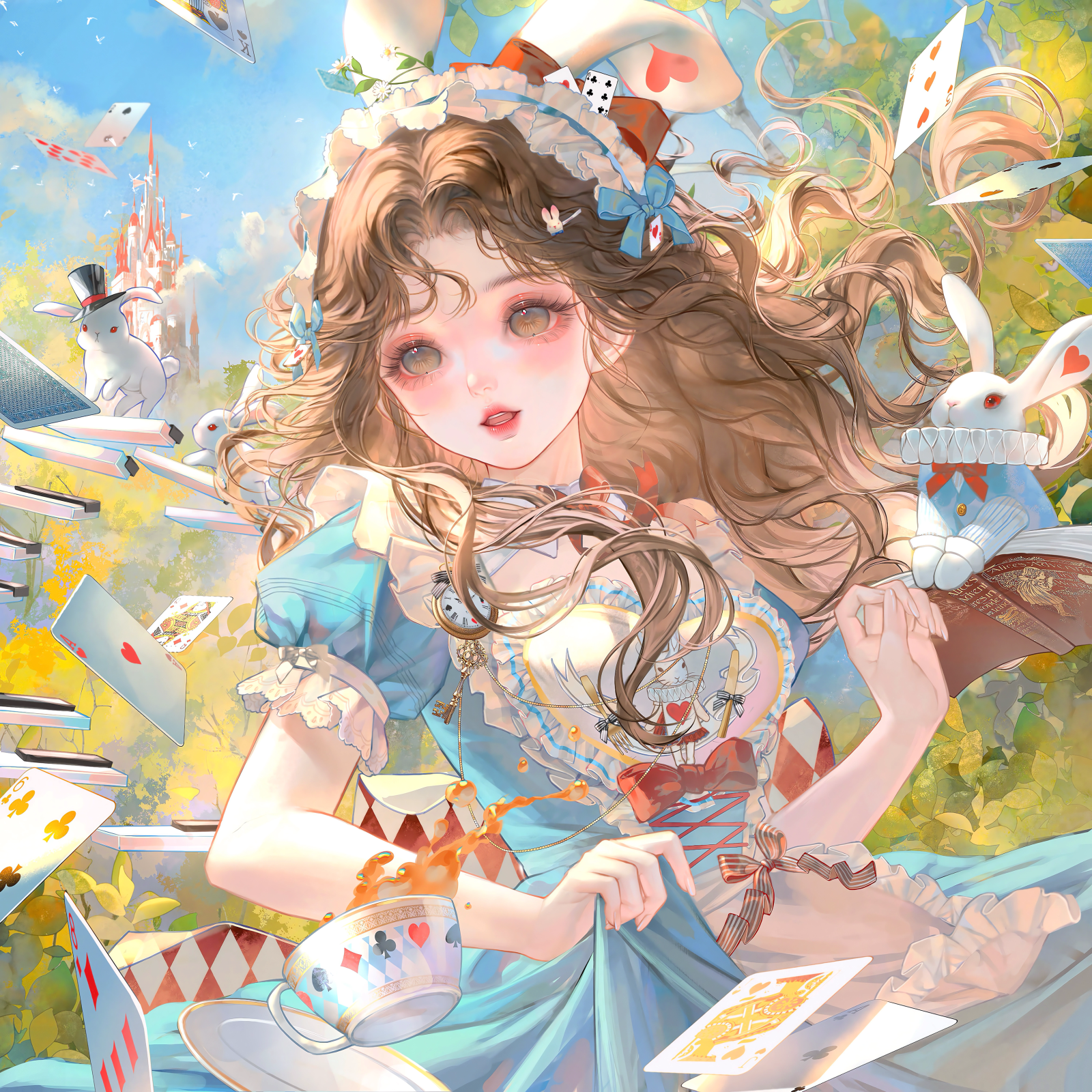 1girl alice_(alice_in_wonderland) animal_ears apron blue_dress blue_sky book bow brown_eyes brown_hair card castle choker cloud cup day diamond_(shape) dress flower frilled_dress frills hair_bow highres holding holding_own_dress large_variant_set long_hair looking_at_viewer open_mouth original outdoors playing_card puffy_short_sleeves puffy_sleeves rabbit rabbit_ears short_sleeves sky solo tea teacup teapot teeth tree variant_set watch white_apron white_rabbit_(alice_in_wonderland) xixizi