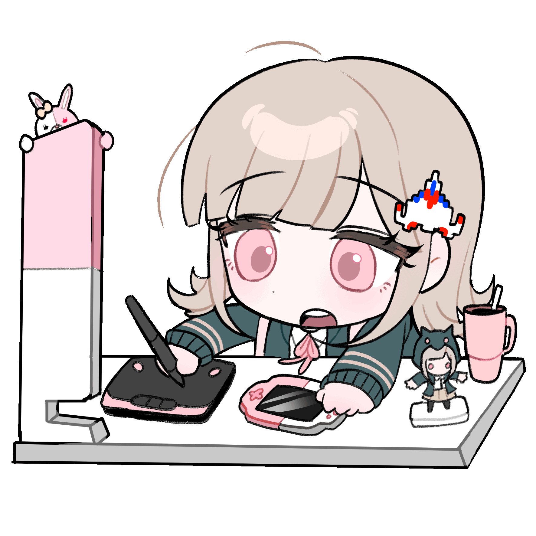 1girl :o ahoge animated animated_gif black_jacket blinking brown_hair chibi chibi_only collared_shirt cup danganronpa_(series) danganronpa_2:_goodbye_despair dot_nose drawing_tablet figure hair_ornament handheld_game_console highres holding holding_stylus jacket long_sleeves medium_hair monomi_(danganronpa) nanami_chiaki neck_ribbon open_clothes open_jacket open_mouth pink_eyes pink_ribbon ribbon shirt simple_background solo stylus teeth transparent_background upper_body upper_teeth_only white_shirt yeonju