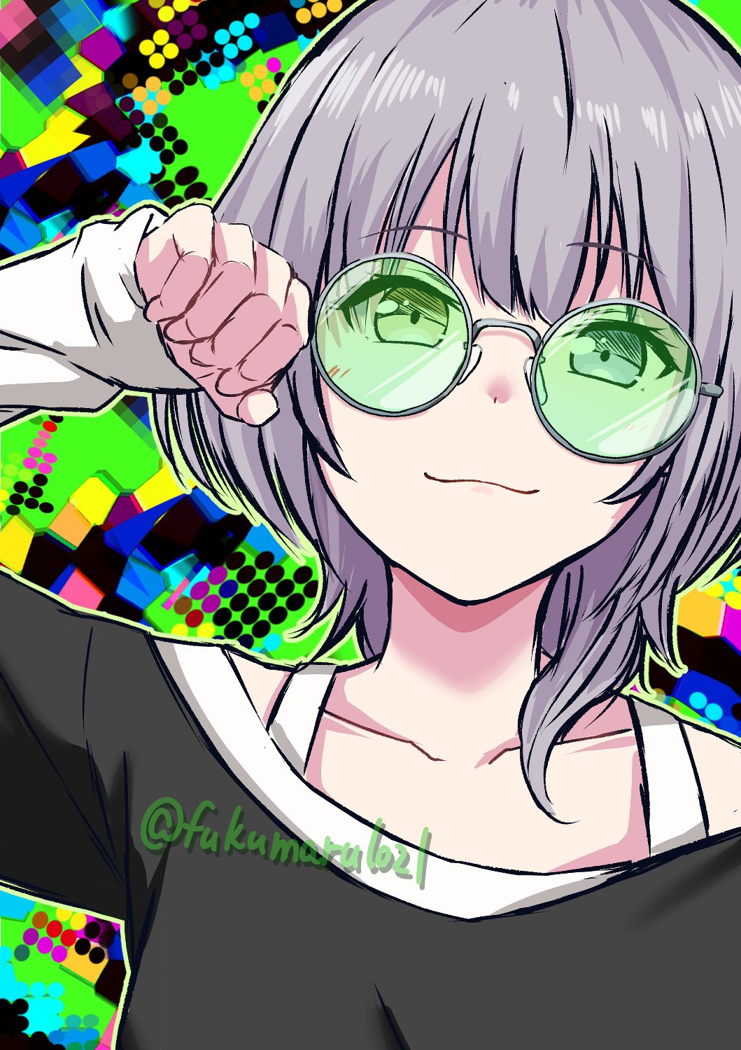 1girl :3 bang_dream! bang_dream!_it's_mygo!!!!! black_shirt blue_eyes closed_mouth commentary fukumaru1021 green-tinted_eyewear hand_up heterochromia highres kaname_raana layered_sleeves long_sleeves looking_at_viewer shirt short_hair short_over_long_sleeves short_sleeves solo sunglasses tinted_eyewear upper_body white_hair white_shirt yellow_eyes