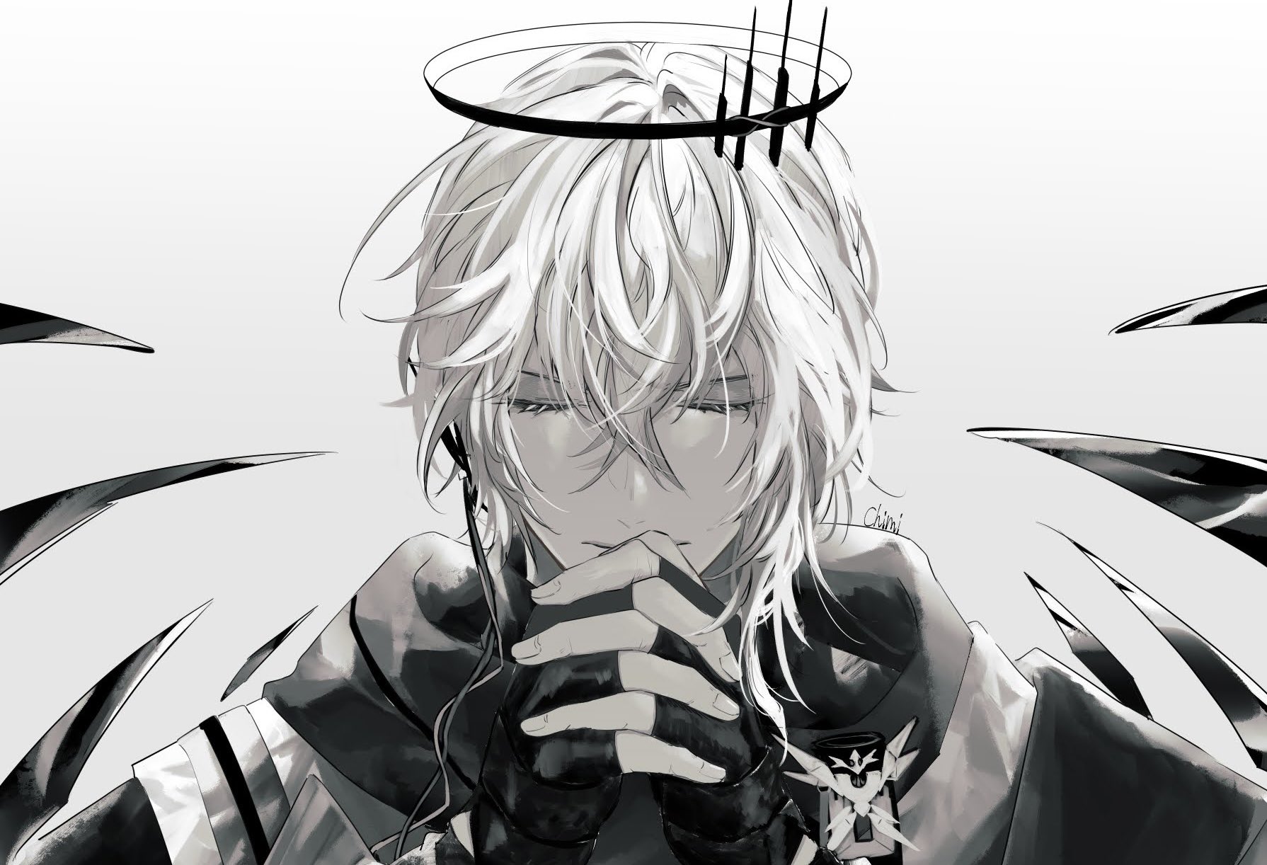 1boy arknights black_gloves chimi_(s8s8_bb) closed_eyes closed_mouth commentary_request executor_(arknights) eyelashes fingerless_gloves fingernails gloves grey_background hair_between_eyes halo highres male_focus own_hands_clasped own_hands_together simple_background solo upper_body