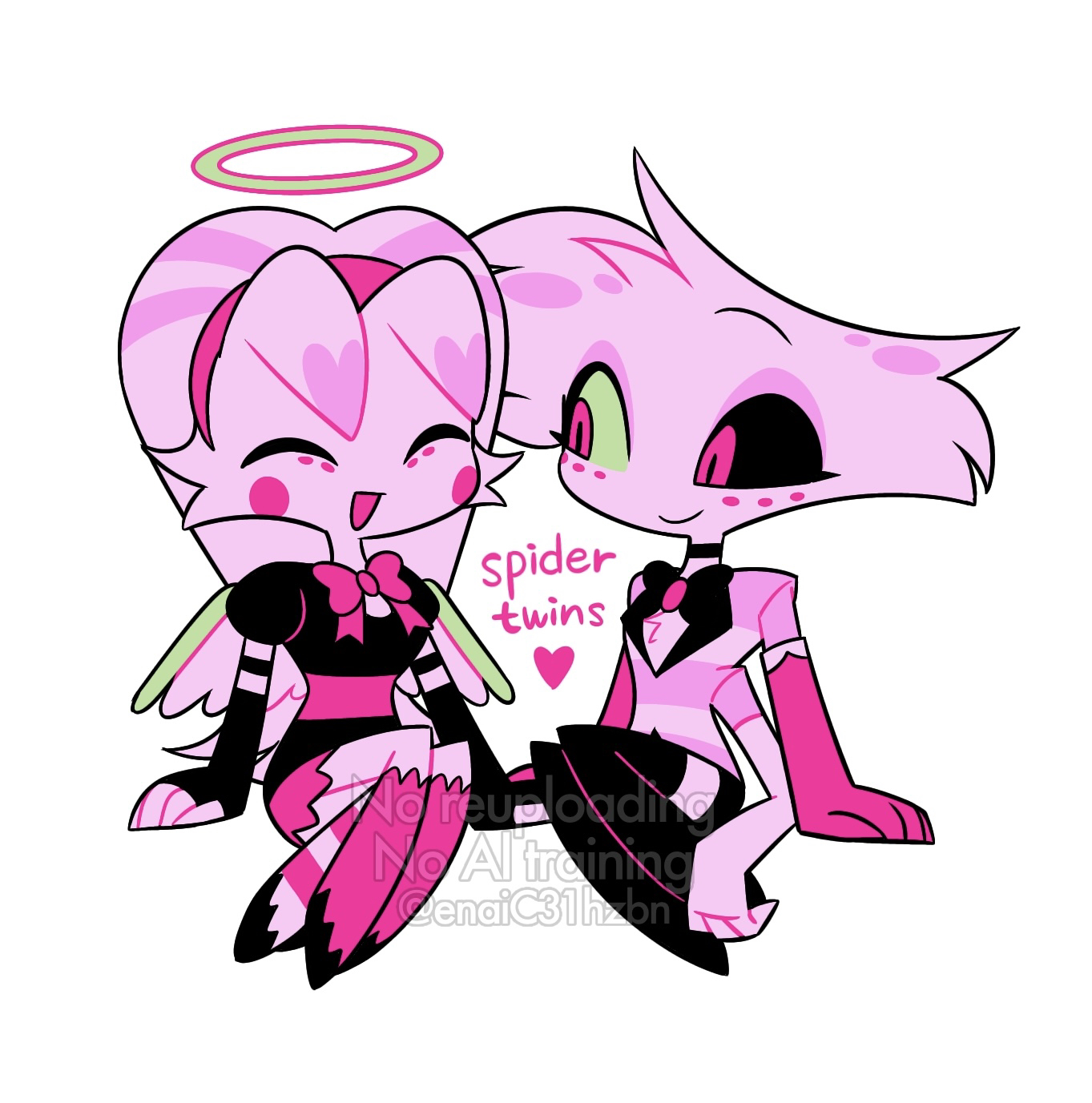 1boy 1girl :d ^_^ angel_dust arm_support black_boots black_bow black_bowtie black_choker black_dress black_sclera black_shorts boots bow bowtie breasts brother_and_sister chibi chibi_only choker circle_facial_mark closed_eyes closed_mouth colored_sclera commentary_request dress elbow_gloves extra_arms extra_legs eyeshadow facial_mark fewer_digits frilled_dress frills full_body furry furry_female gloves hairband halo hazbin_hotel heart hellaverse highres hooves horns invisible_chair juliet_sleeves long_hair long_sleeves looking_at_another makeup menma_(enaic31) mismatched_sclera molly_(hazbin_hotel) open_mouth pink_bow pink_bowtie pink_eyes pink_eyeshadow pink_gloves pink_hairband pink_shirt puffy_sleeves shirt short_dress short_shorts shorts siblings simple_background sitting small_breasts smile striped_clothes striped_shirt thigh_boots traditional_bowtie twins twitter_username two-tone_shirt two-tone_wings very_long_hair watermark white_background white_fur white_gloves white_shirt white_wings wings yellow_halo yellow_sclera yellow_wings